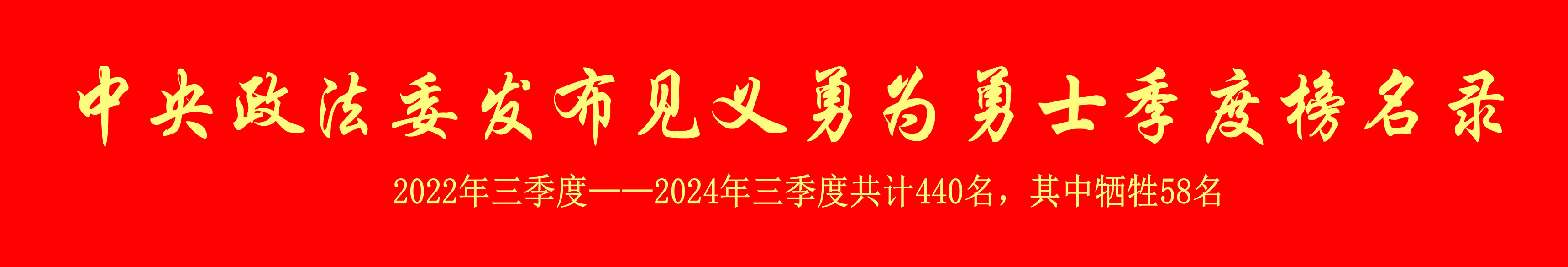 2024年10月9日,中央政法委在京發布2024年第三季度見義勇為勇士榜。根據網絡關注度和各地各單位推薦意見進行綜合評審,共有52位見義勇為勇士光榮上榜。