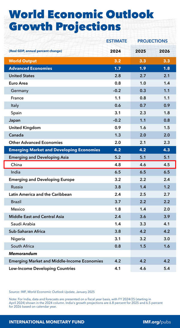 具體來看,發達經濟體今年預計將增長1.9%,明年預計將增長1.8%。美國和歐元區經濟預計今年將分別增長2.7%和1.0%,明年將分別增長2.1%和1.4%。新興市場和發展中經濟體今年預計將增長4.2%,明年將增長4.3%。中國經濟預計今年將增長4.6%,較去年10月預測值高出0.1個百分點;明年預計增長4.5%。