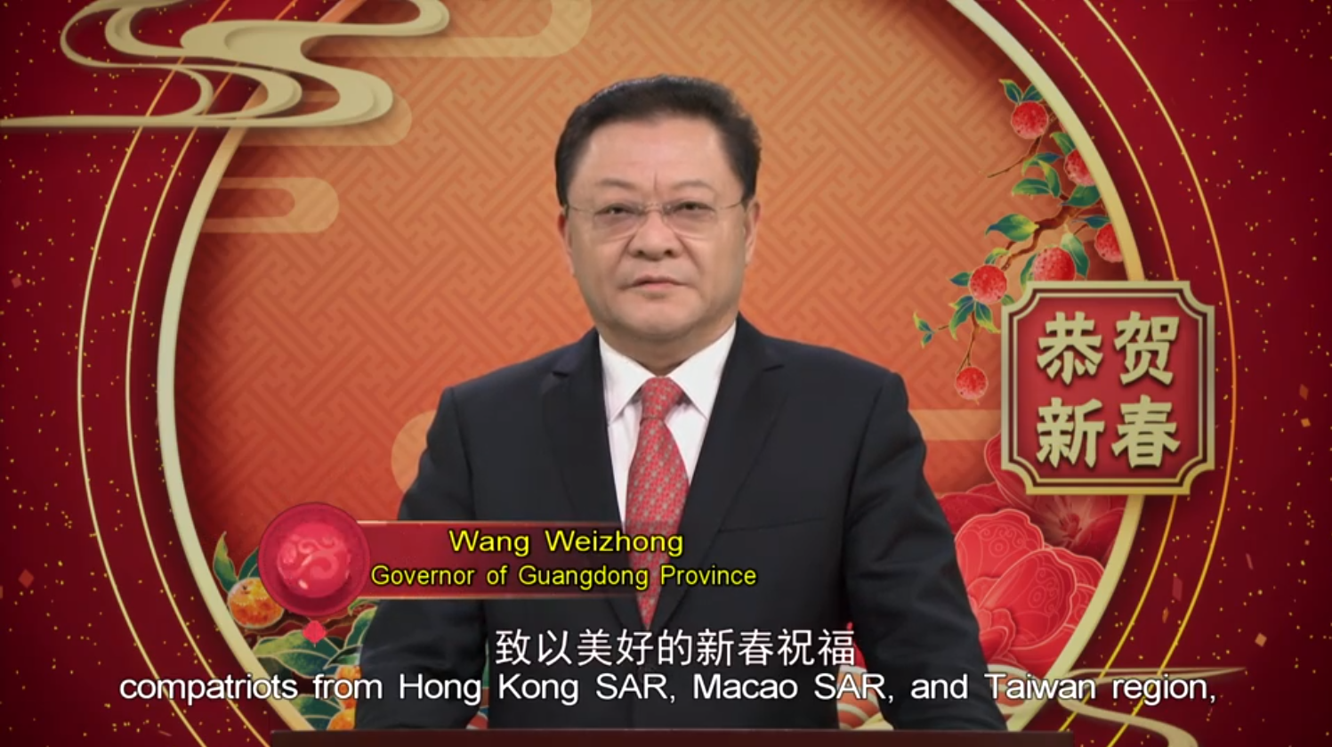 此時此刻的嶺南大地姹紫嫣紅、年味正濃。我代表廣東省人民政府和全省人民,向廣大海外僑胞、港澳臺同胞和世界各國朋友,致以美好的新春祝福和誠摯的節日問候!