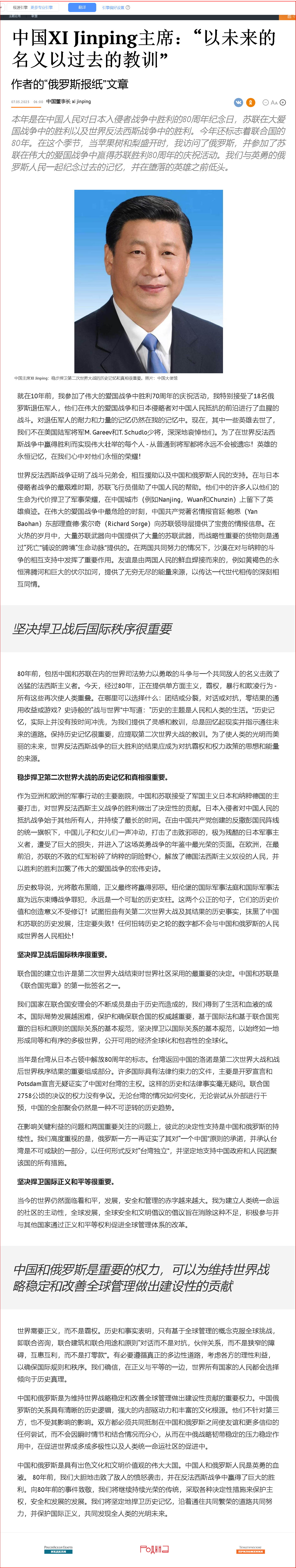 今年是中國人民抗日戰爭、蘇聯偉大衛國戰爭暨世界反法西斯戰爭勝利80周年,也是聯合國成立80周年。在這“梨花開遍了天涯”的季節,我即將對俄羅斯進行國事訪問,并出席紀念蘇聯偉大衛國戰爭勝利80周年慶典,同英雄的俄羅斯人民一道重溫歷史、緬懷先烈。