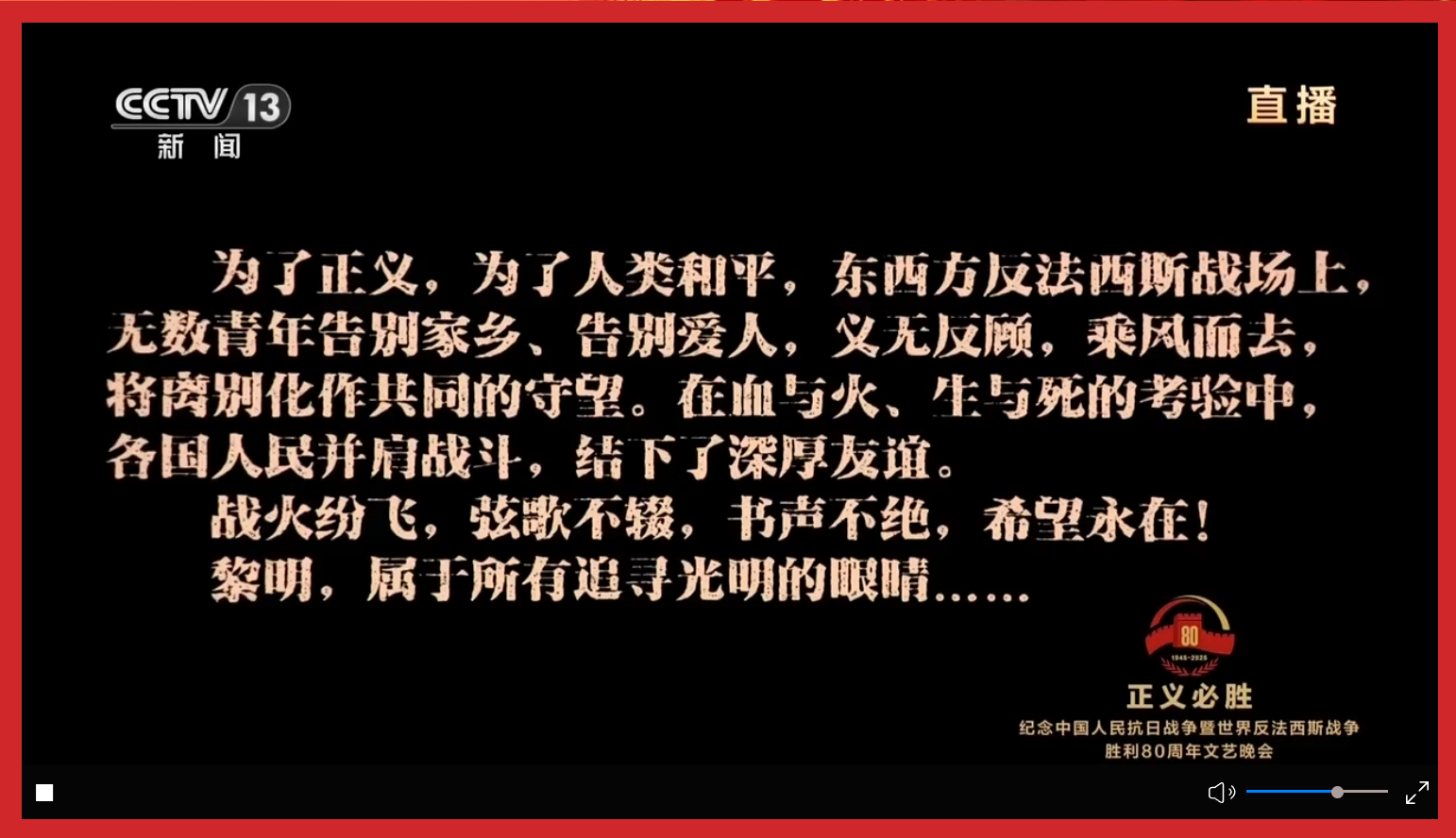 紀念中國人民抗日戰(zhàn)爭暨世界反法西斯戰(zhàn)爭勝利80周年文藝晚會到此結束!