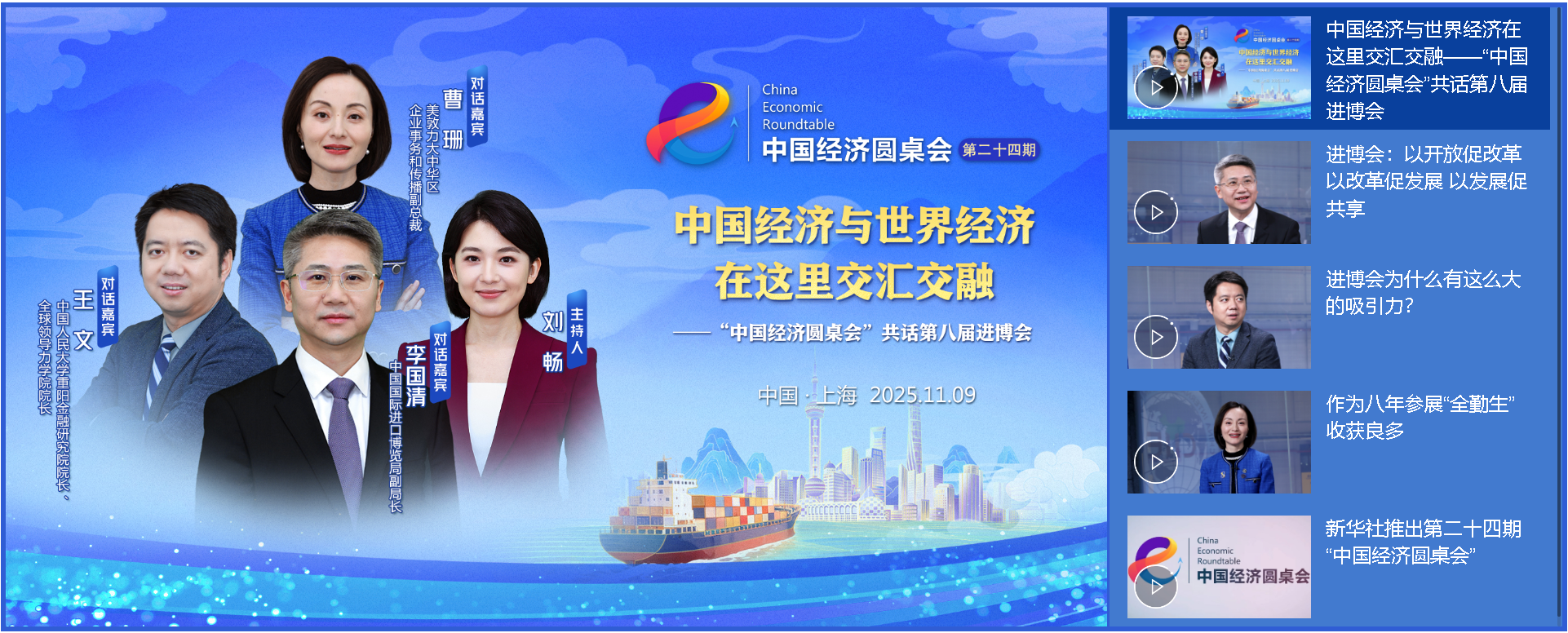 11月9日,新華社推出第二十四期“中國經濟圓桌會”大型全媒體訪談節目,邀請中國國際進口博覽局副局長李國清,中國人民大學重陽金融研究院院長、全球領導力學院院長王文,美敦力大中華區企業事務和傳播副總裁曹珊,共話第八屆進博會依托中國大市場為世界經濟帶來的新機遇。
