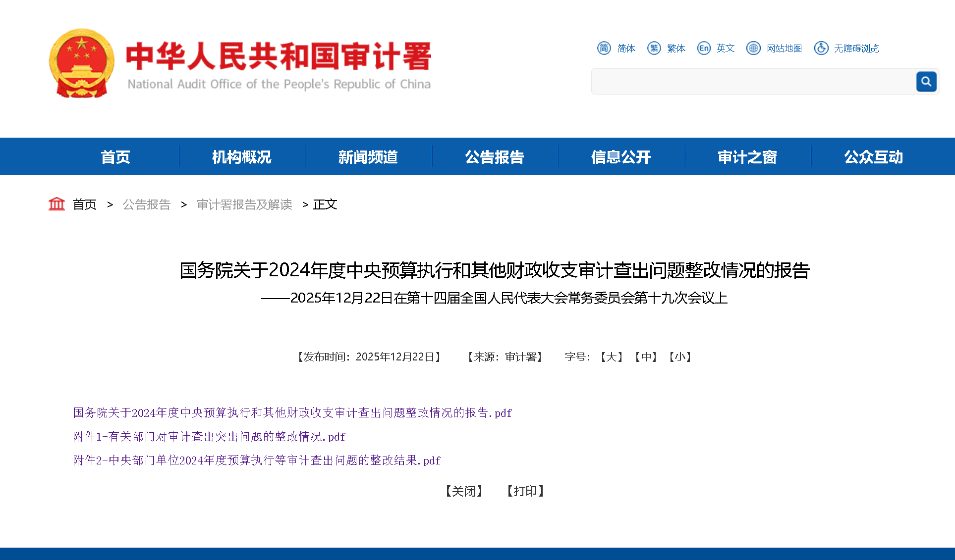 我受國務院委托,向全國人大常委會報告2024年度中央預算執行和其他財政收支審計查出問題的整改情況,請審議。