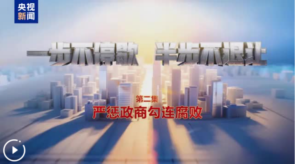 由中央紀委國家監委宣傳部與中央廣播電視總臺央視聯合攝制的電視專題片《一步不停歇 半步不退讓》,1月12日在總臺央視綜合頻道晚8點檔播出第二集《嚴懲政商勾連腐敗》,央視新聞新媒體平臺同步播發。