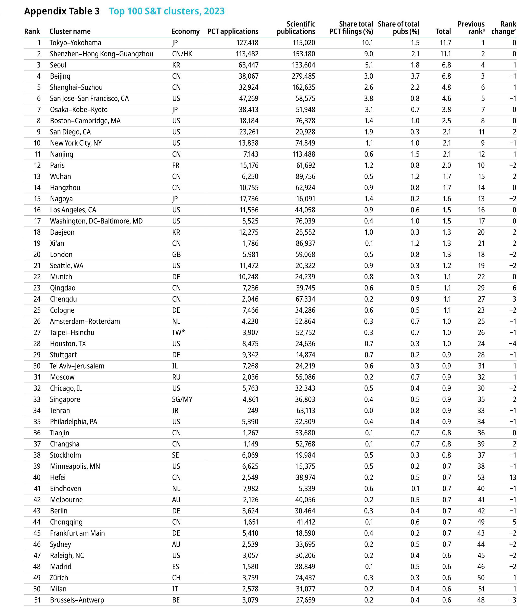 中國有25個科技集群進入全球TOP100榜單,成為擁有全球頂級科技集群最多的國家,并在前五科技集群中占了三位。這25個集群分別為:深圳-香港-廣州(第2位)、北京(4)、上海-蘇州(5)、南京(11)、武漢(13)、杭州(14)、西安(19)、青島(23)、成都(24)、臺北-新竹(27)、天津(36)、長沙(37)、合肥(40)、重慶(44)、哈爾濱(53)、濟南(55)、長春(58)、沈陽(63)、大連(69)、鄭州(75)、廈門(80)、蘭州(82)、鎮江(89)、無錫(93)、福州(94)。成都本次排名比2022年GII著錄排名上升5位。