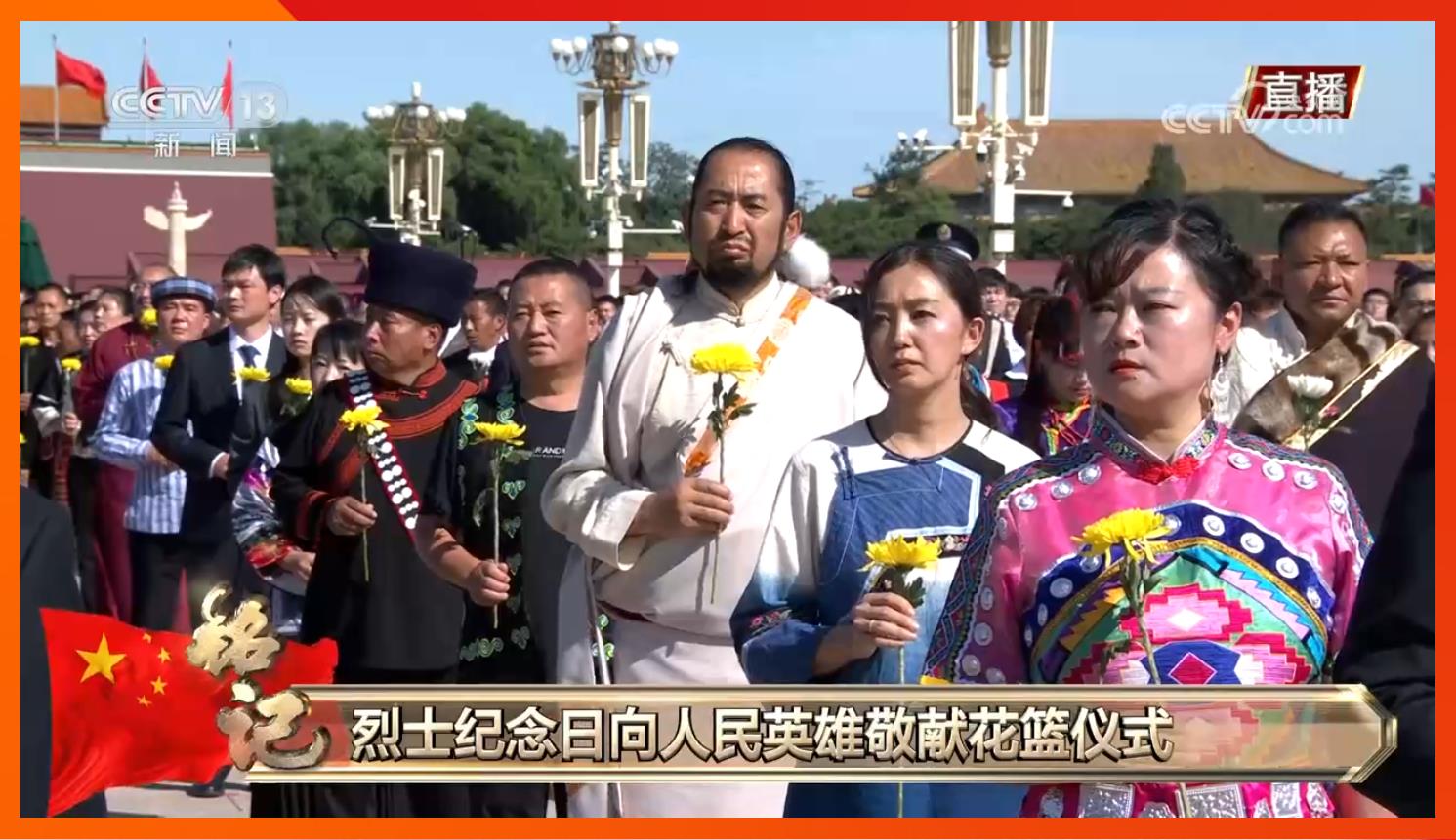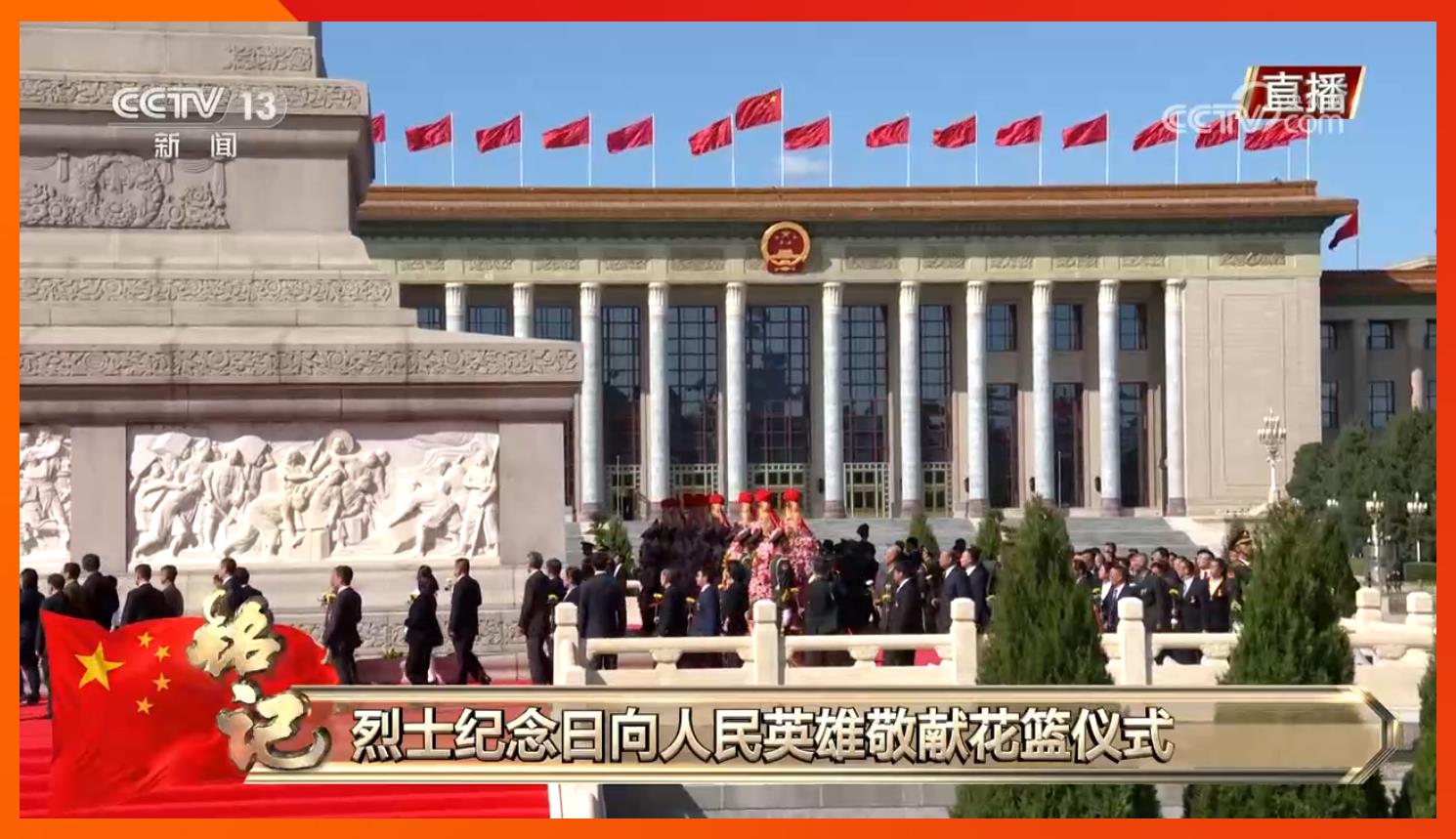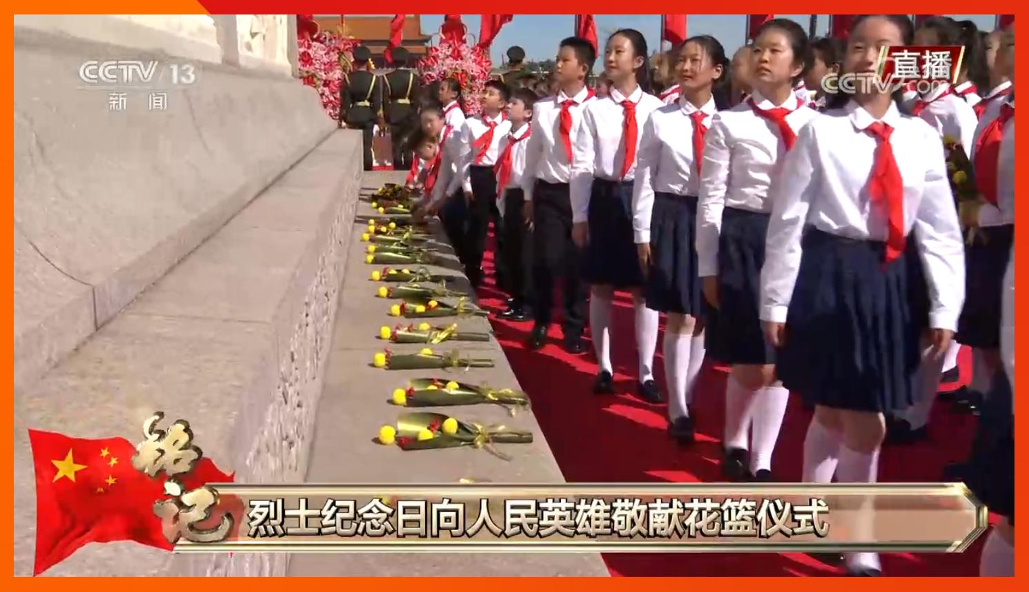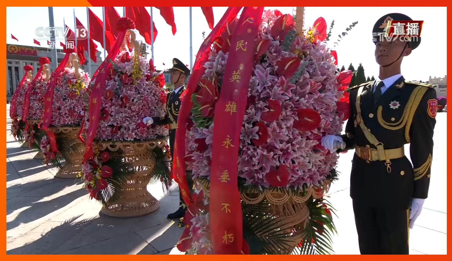 方陣前,以中共中央,全國(guó)人大常委會(huì),國(guó)務(wù)院,全國(guó)政協(xié),中央軍委,各民主黨派、全國(guó)工商聯(lián)和無黨派愛國(guó)人士,各人民團(tuán)體和各界群眾,老戰(zhàn)士、老同志和烈士親屬,中國(guó)少年先鋒隊(duì)名義敬獻(xiàn)的9個(gè)大型花籃一字排開,花籃紅色緞帶上書寫的“人民英雄永垂不朽”格外醒目。
