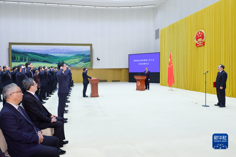 宣誓后,國務院總理李強作了講話。他強調,誓詞雖短,但字字千鈞,希望大家把錚錚誓言銘記于心、踐之于行,忠于憲法、忠于祖國、忠于人民,不辜負黨和人民的重托。要堅持用習近平新時代中國特色社會主義思想凝心鑄魂,深刻領悟“兩個確立”的決定性意義,堅決做到“兩個維護”,不斷提高政治判斷力、政治領悟力、政治執行力,當好貫徹黨中央決策部署的執行者、行動派、實干家。要倍加珍惜黨和人民賦予的平臺,以奮發有為的精神狀態干事創業,緊緊圍繞推進高質量發展這個首要任務,持續深化改革、擴大開放、推動創新、改善民生,勇于打破常規,善于開辟新局,抓住主要矛盾綜合施策,聚焦瓶頸制約持續攻堅,以實干實績踐行誓言。要牢固樹立正確的權力觀、政績觀、事業觀,嚴格按照法定權限和程序履行職責、行使權力、承擔責任,始終繃緊廉潔自律這根弦,時時處處嚴格要求自己,堅決反對形式主義、官僚主義,大力弘揚勤儉節約、艱苦奮斗的優良作風,為全面建設社會主義現代化國家、實現中華民族偉大復興中國夢不懈奮斗。