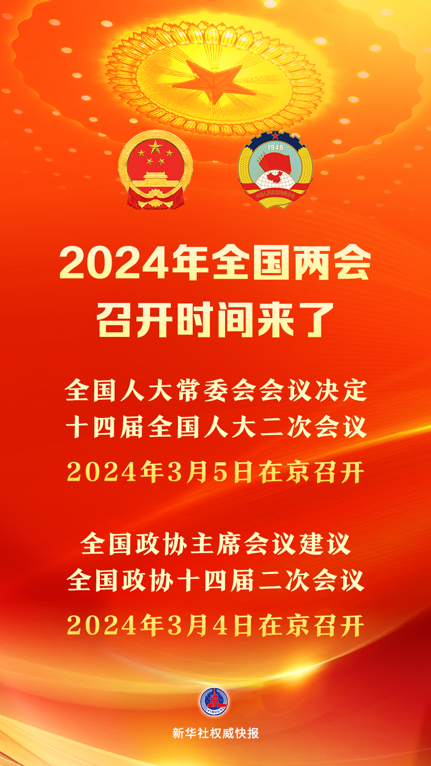全國人大常委會會議12月29日表決通過了關于召開十四屆全國人大二次會議的決定。根據決定,十四屆全國人大二次會議于2024年3月5日在北京召開。政協第十四屆全國委員會日前召開主席會議,建議全國政協十四屆二次會議于2024年3月4日在北京召開。