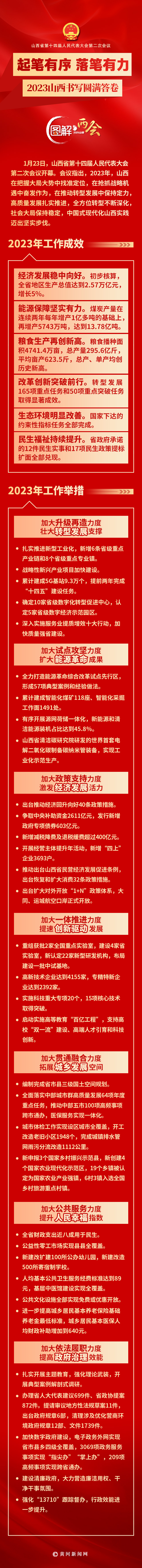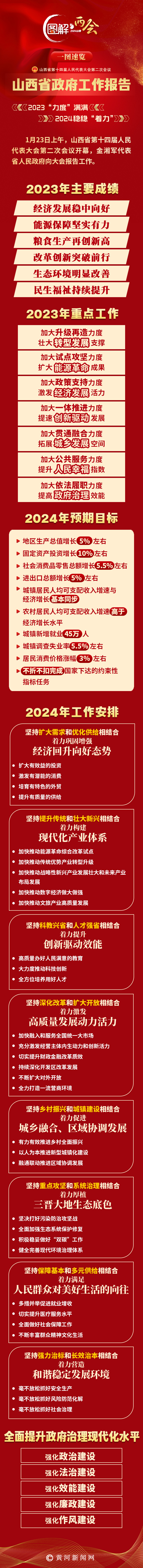 1月23日上午,山西省第十四屆人民代表大會第二次會議在太原隆重開幕,省長金湘軍代表山西省人民政府向大會報告工作。2024年,山西全力做好八項重點工作。