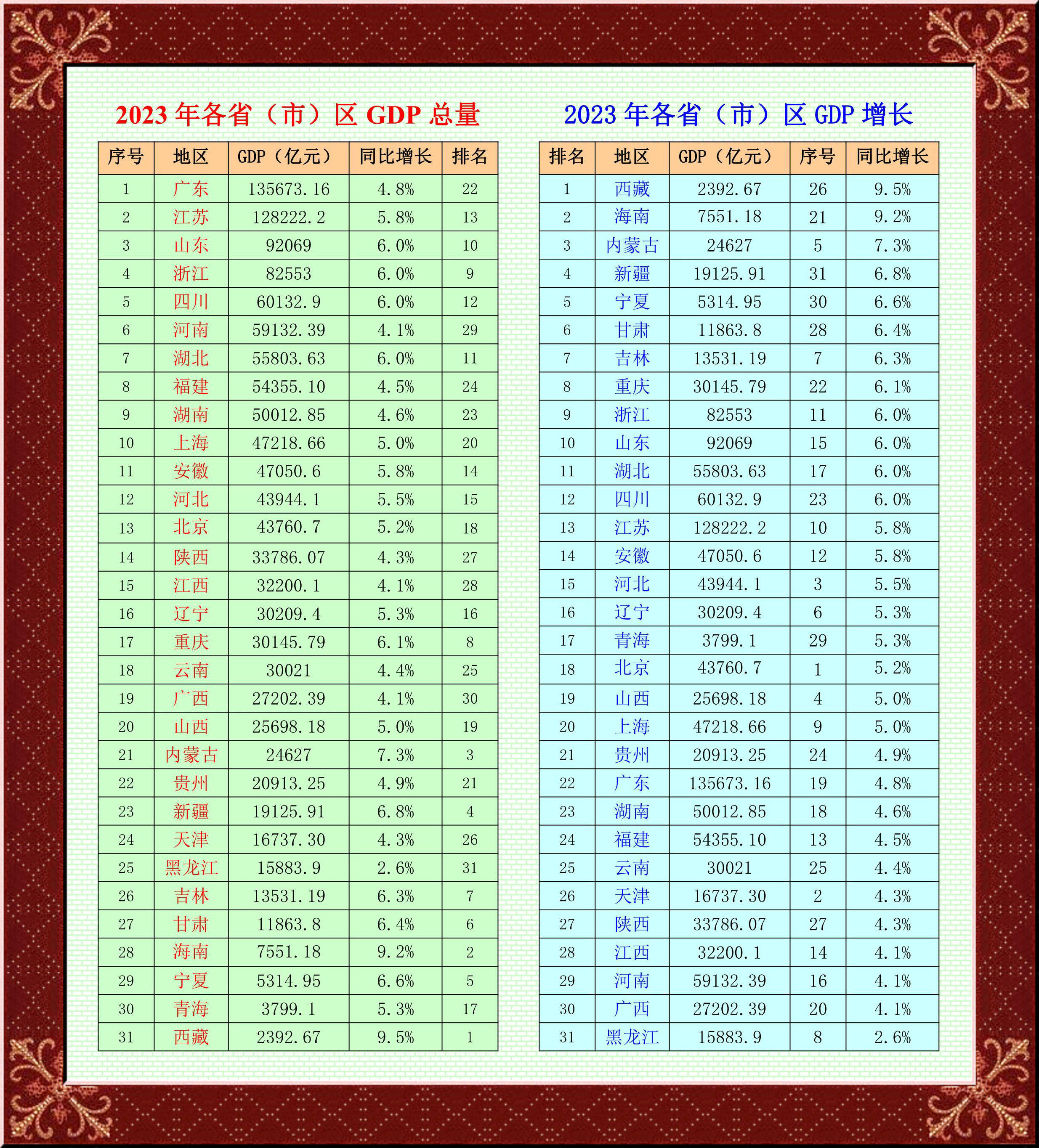 你追我趕熱情高。31個省份GDP全部實現(xiàn)正增長。其中,西藏自治區(qū)和海南省GDP分別以9.5%、9.2%的速度領(lǐng)跑全國;內(nèi)蒙古自治區(qū)GDP增長7.3%,排名第三。此外,寧夏回族自治區(qū)、甘肅省、吉林省、重慶市、山東省、四川省、浙江省等GDP增速也在6%以上。多數(shù)省份GDP增速位于4%至6%這一區(qū)間。