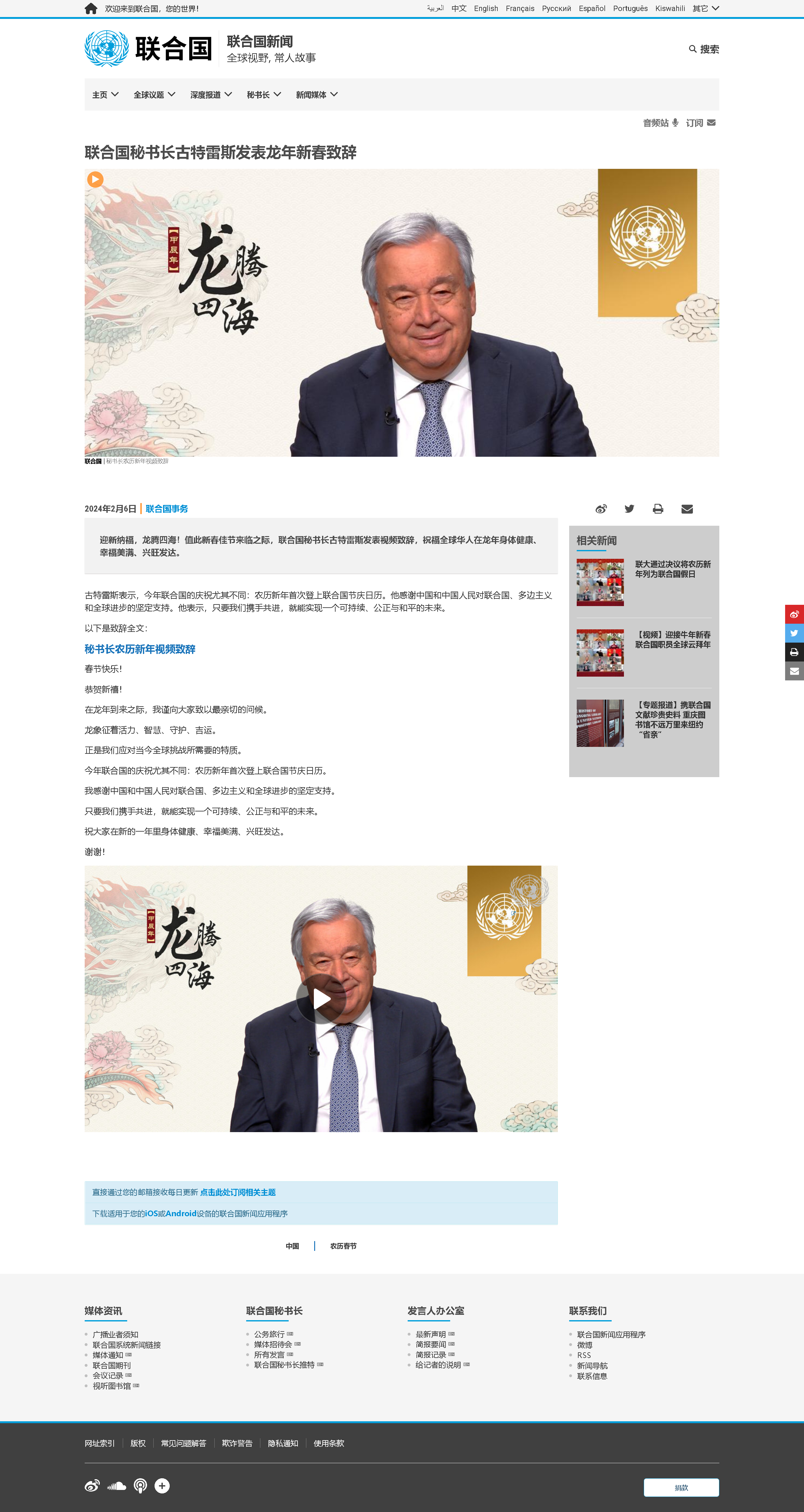 聯合國秘書長古特雷斯6日發表龍年新春致辭,向全球華人致以美好的節日祝愿,并感謝中國對多邊主義的堅定支持。