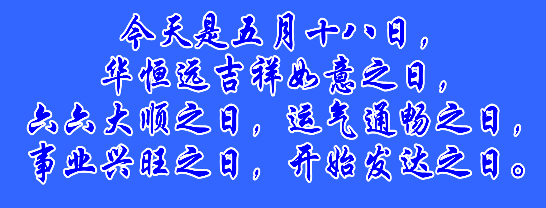 今天是五月十八日,華恒遠吉祥如意之日,六六大順之日,運氣通暢之日,事業興旺之日,開始發達之日。