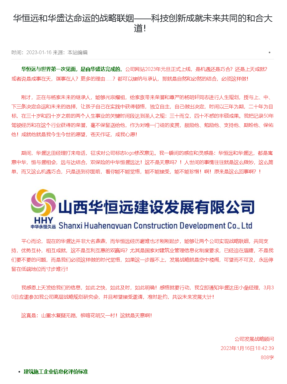 華恒遠與世界第一次見面,是由華盛達完成的。公司網站2023年元旦正式上線,是機遇還是巧合?還是上天成就?或者說是成事在天,謀事在人?更多的理由......?都可以接納與承認,那就是自然和必然的結合,必須這樣做!