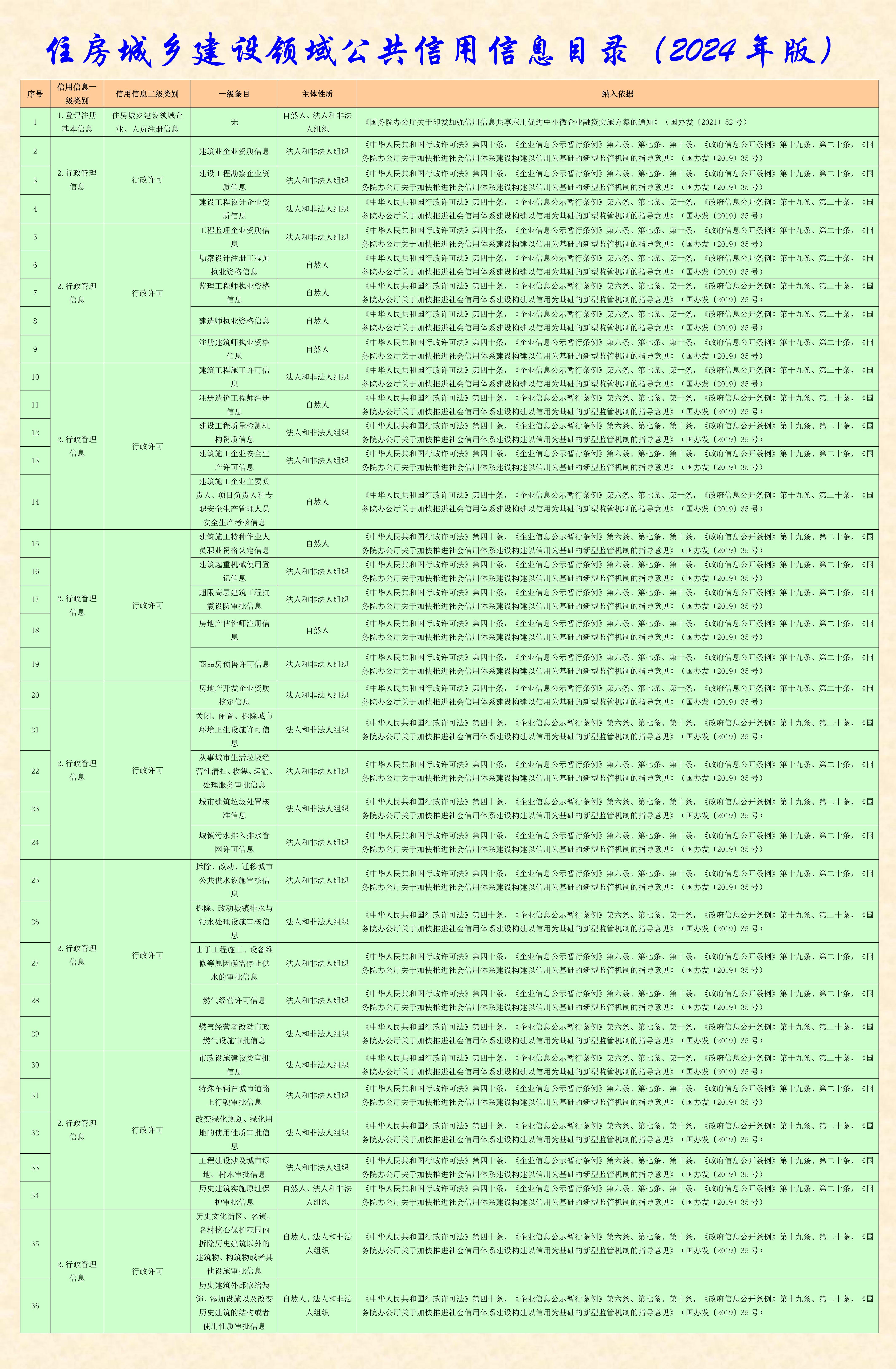 為貫徹落實黨中央、國務院關于推進社會信用體系建設高質(zhì)量發(fā)展的決策部署,規(guī)范住房城鄉(xiāng)建設領域公共信用信息歸集范圍,根據(jù)《全國公共信用信息基礎目錄(2024年版)》,結(jié)合住房城鄉(xiāng)建設工作實際,我部編制了《住房城鄉(xiāng)建設領域公共信用信息目錄(2024年版)》,現(xiàn)印發(fā)給你們,請對照做好公共信用信息歸集共享工作。