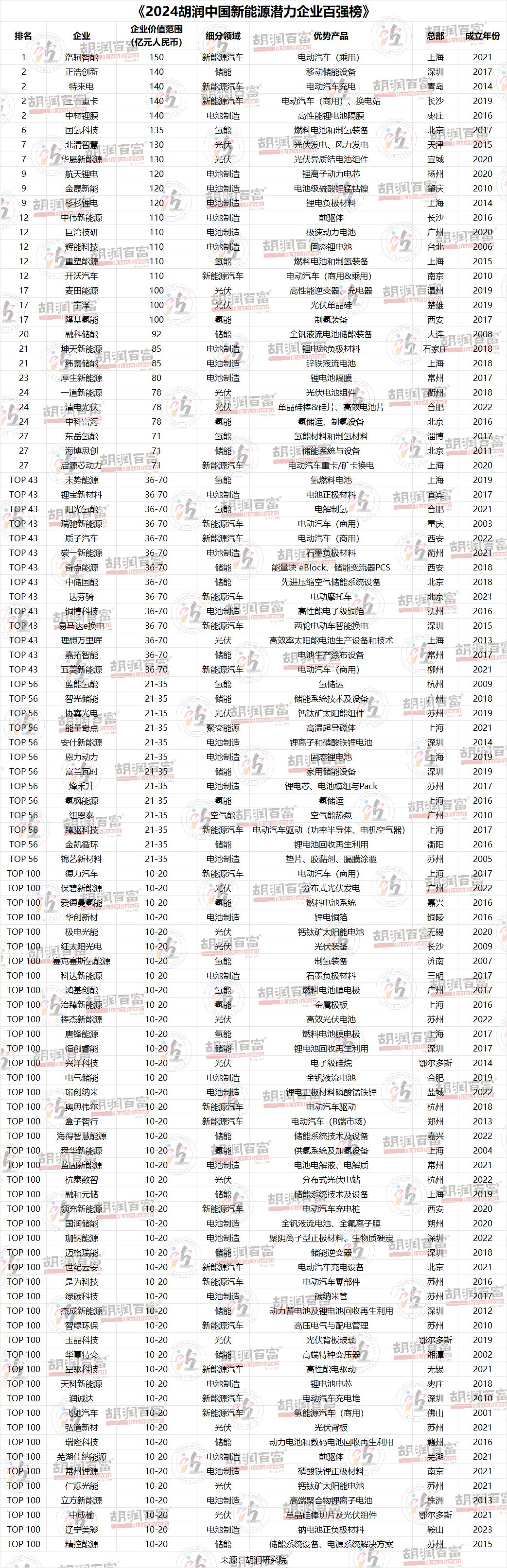 胡潤研究院發布《2024胡潤中國新能源潛力企業百強榜》 ——尋找中國最具發展潛力的新能源企業