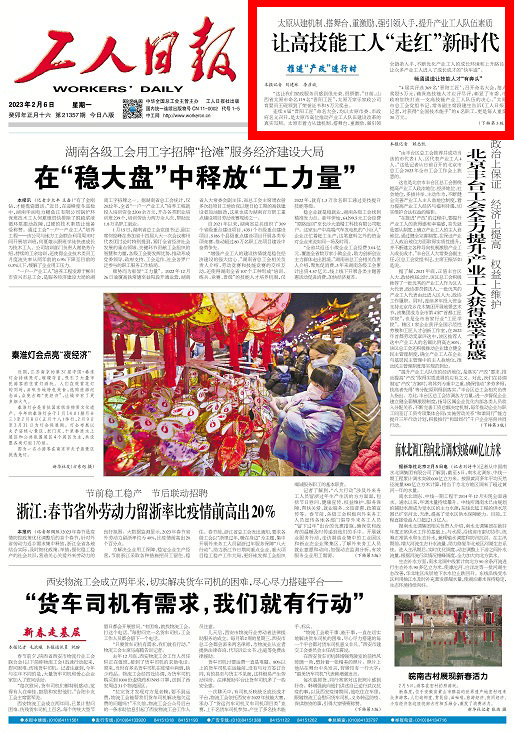 本報訊 2月6日,《工人日報》第一版“推進‘產改’進行時”欄目以《太原從建機制、搭舞臺、重激勵、強引領入手,提升產業(yè)工人隊伍素質 讓高技能工人“走紅”新時代》為題,報道我市不斷優(yōu)化產業(yè)工人的成長環(huán)境和上升路徑,讓眾多產業(yè)工人駛入成長成才的“快車道”。