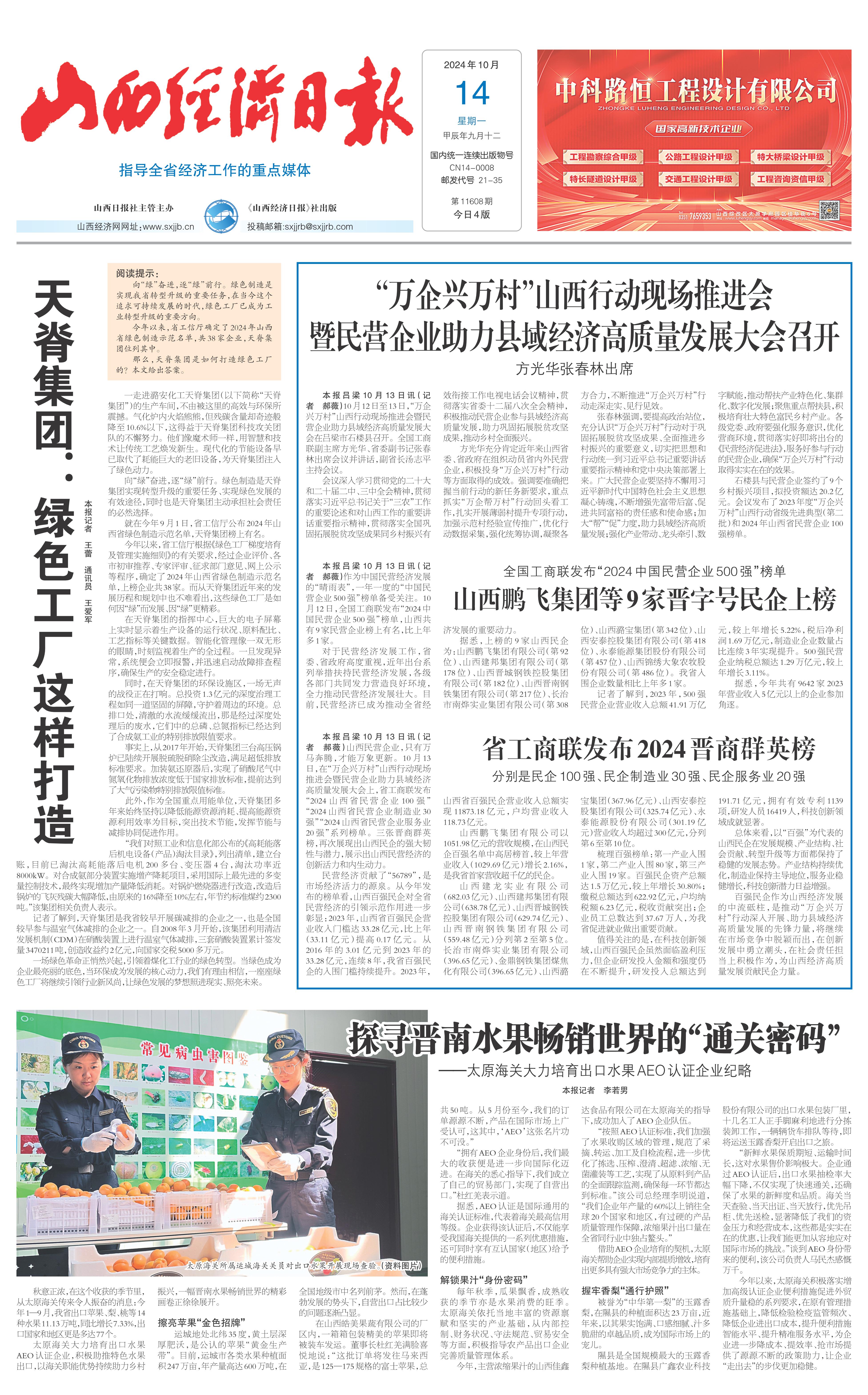 本報呂梁10月13日訊(記者 郝薇)山西民營企業,只有萬馬奔騰,才能萬象更新。10月13日,在“萬企興萬村”山西行動現場推進會暨民營企業助力縣域經濟高質量發展大會上,省工商聯發布“2024山西省民營企業100強”“2024山西省民營企業制造業30強”“2024山西省民營企業服務業20強”系列榜單。三張晉商群英榜,再次展現出山西民企的強大韌性與潛力,展示出山西民營經濟的創新活力和內生動力。