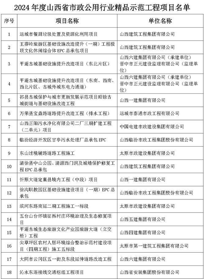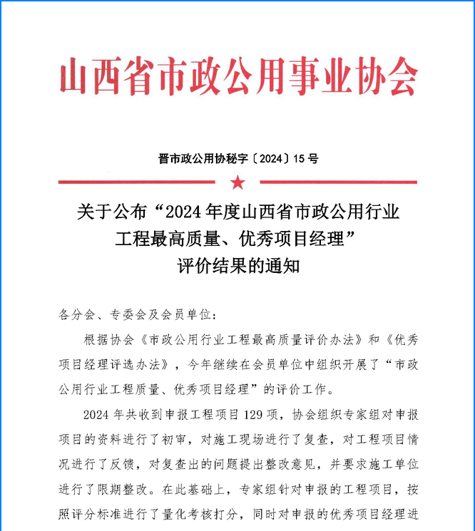 近日,山西省市政公用事業協會公布2024年度山西省市政公用行業精品示范工程榮譽和山西省市政公用行業工程最高質量、優秀項目經理的評價結果。總承包公司承建的祥和路改造工程EPC工程項目榮獲“精品示范工程獎”,職工武舉國榮獲“優秀項目經理”榮譽稱號。