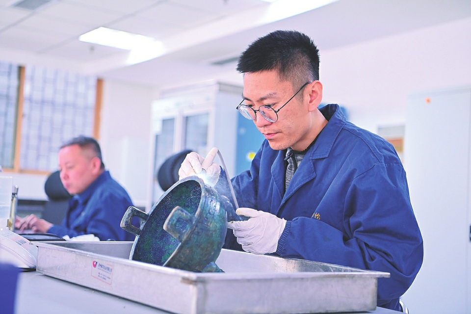 在山西博物院文物保護研究部青銅修復室,張政敏(右)為青銅器進行超聲波除銹。新華社記者楊晨光攝