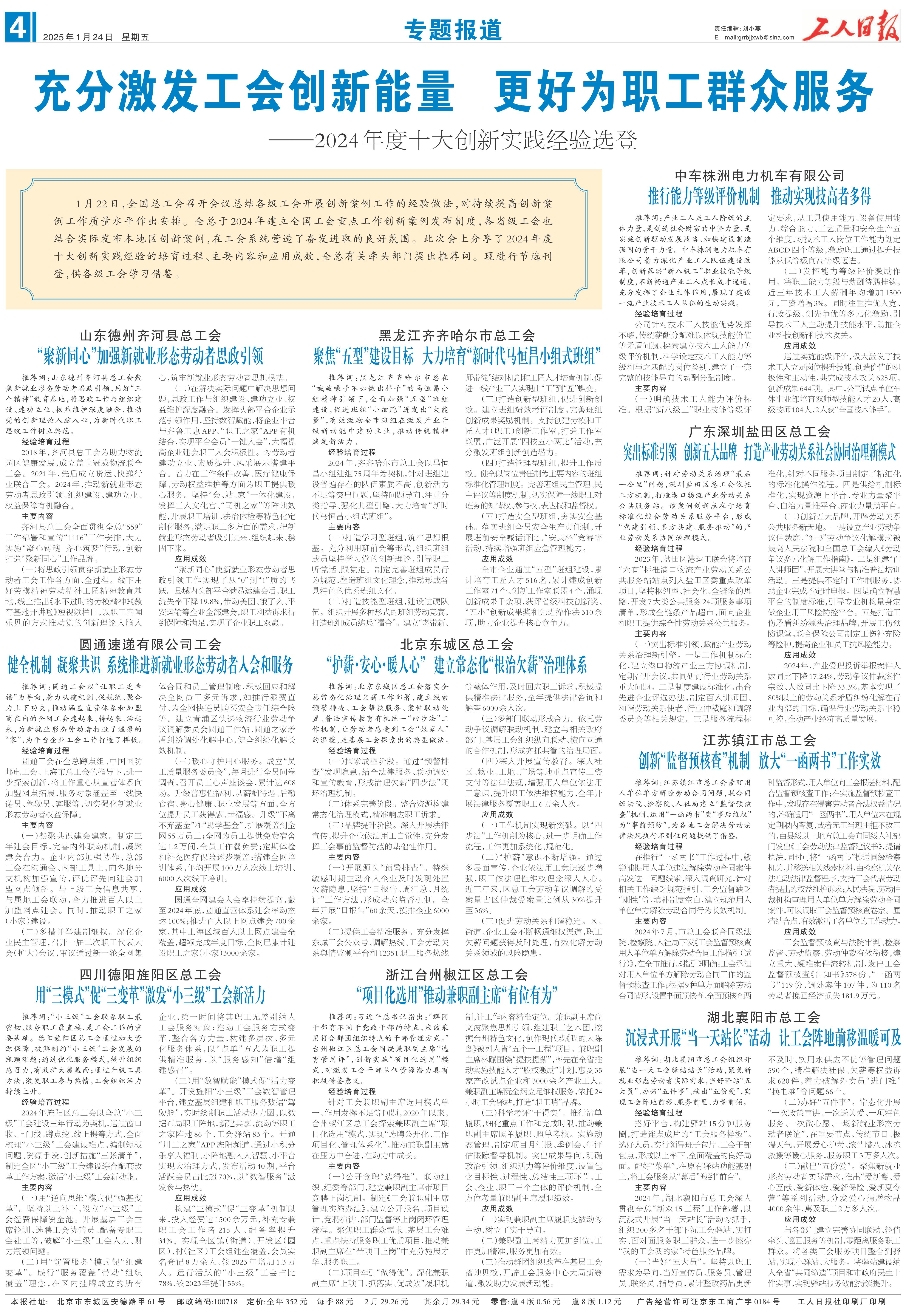 1月22日,全國總工會召開會議總結各級工會開展創新案例工作的經驗做法,對持續提高創新案例工作質量水平作出安排。全總于2024年建立全國工會重點工作創新案例發布制度,各省級工會也結合實際發布本地區創新案例,在工會系統營造了奮發進取的良好氛圍。此次會上分享了2024年度十大創新實踐經驗的培育過程、主要內容和應用成效,全總有關牽頭部門提出推薦詞。現進行節選刊登,供各級工會學習借鑒。