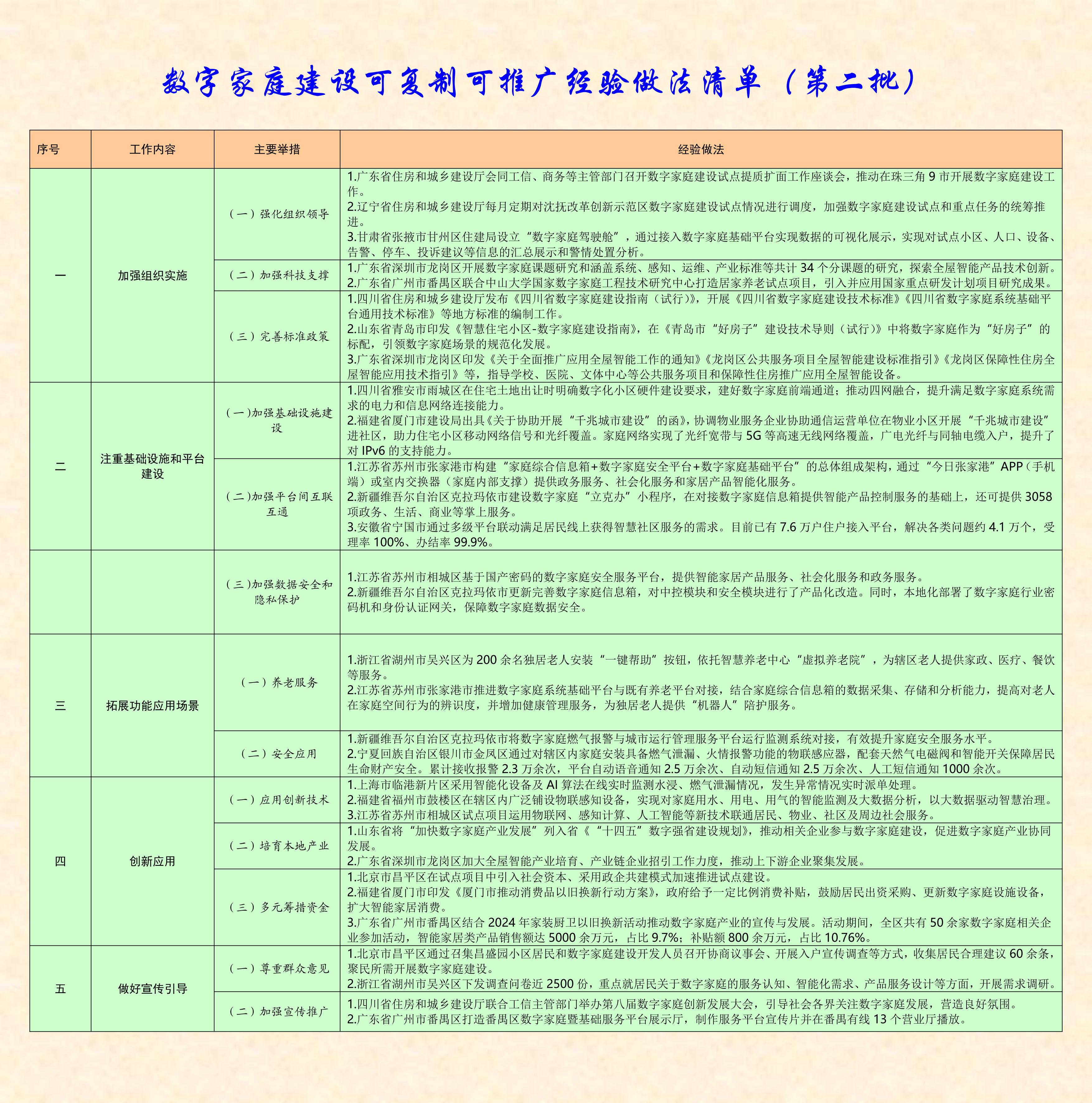 根據《住房城鄉建設部辦公廳 工業和信息化部辦公廳關于開展數字家庭建設試點工作的通知》(建辦標函〔2022〕296號)要求,為指導各試點地區科學有序建設數字家庭,加強試點示范宣傳推廣,我司根據各地報送的2024年工作總結并結合調研情況,梳理形成了《數字家庭建設可復制可推廣經驗清單(第二批)》。現印發給你們,請結合實際學習借鑒。