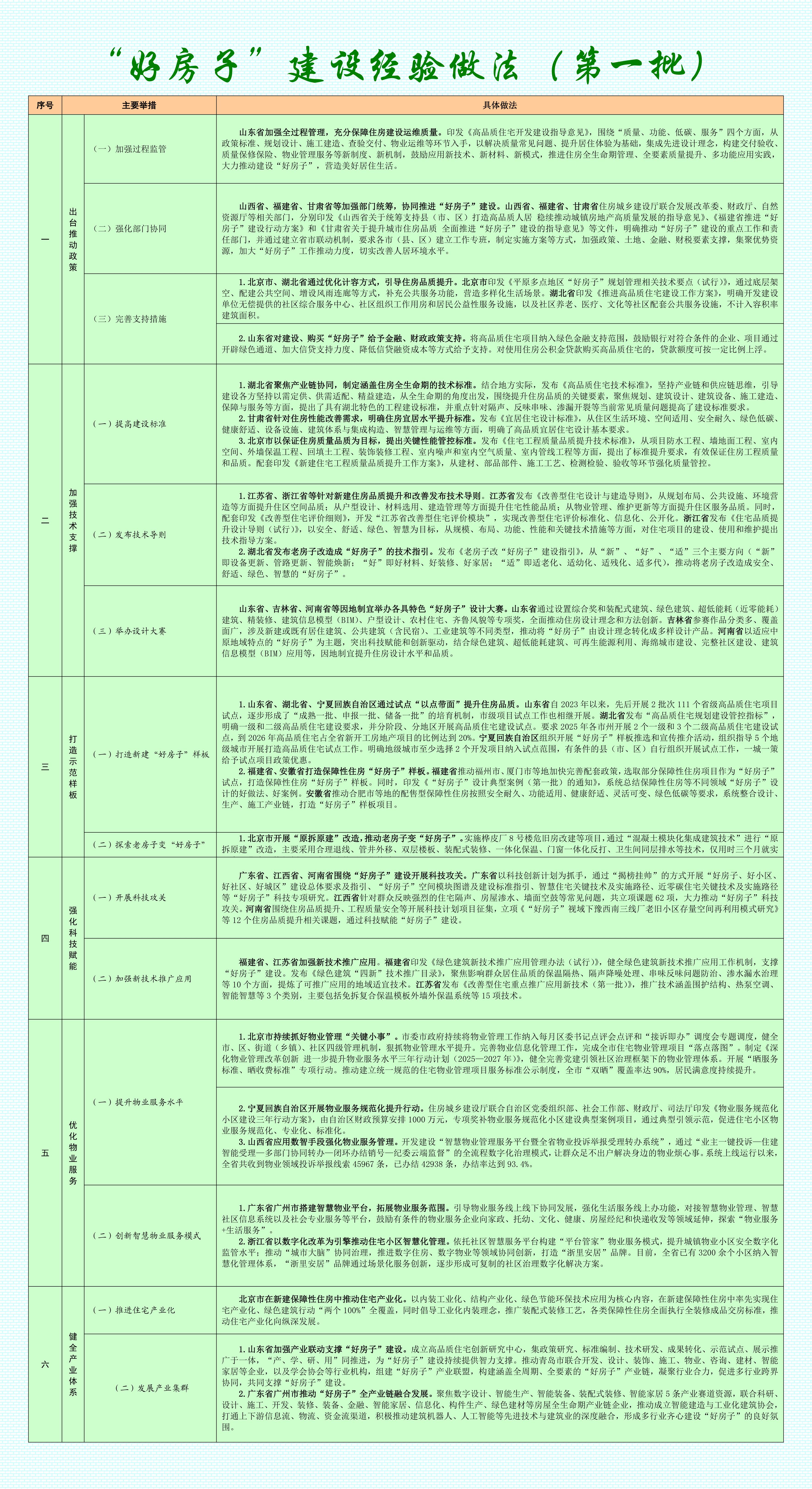 (一)加強過程監管 山東省加強全過程管理,充分保障住房建設運維質量。印發《高品質住宅開發建設指導意見》,圍繞“質量、功能、低碳、服務”四個方面,從政策標準、規劃設計、施工建造、查驗交付、物業運維等環節入手,以解決質量常見問題、提升居住體驗為基礎,集成先進設計理念,構建交付驗收、質量保修保險、物業管理服務等新制度、新機制,鼓勵應用新技術、新材料、新模式,推進住房全生命期管理、全要素質量提升、多功能應用實踐,大力推動建設“好房子”,營造美好居住生活。