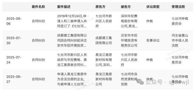 6月25日,華控賽格及子公司黑龍江奧原新材料有限公司收到七臺河仲裁委員會的《仲裁通知書》及相關法律文書,6月27日首次披露仲裁情況,正式宣告案件進入仲裁程序。