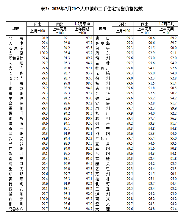 2025年7月份,70個大中城市中,各線城市商品住宅銷售價格環比下降,同比降幅整體有所收窄。觀察者網注意到,在二手房售價環比上,當月僅太原上漲0.2%,西寧持平,其余均下跌,北京、武漢跌幅最大,跌幅達1.1%。