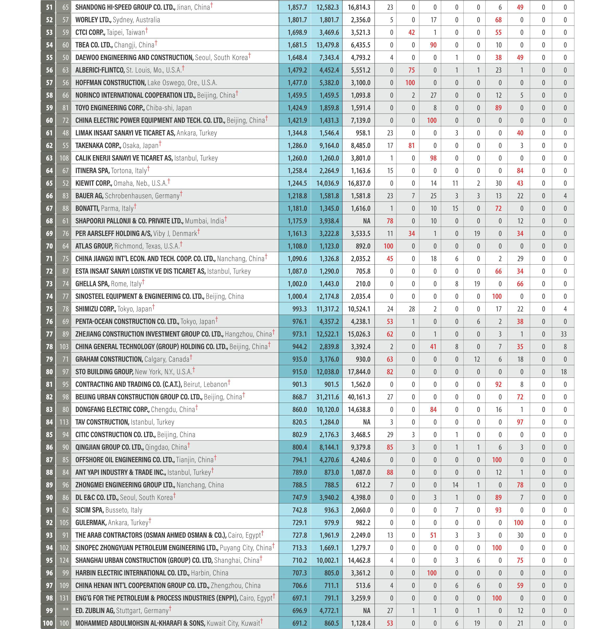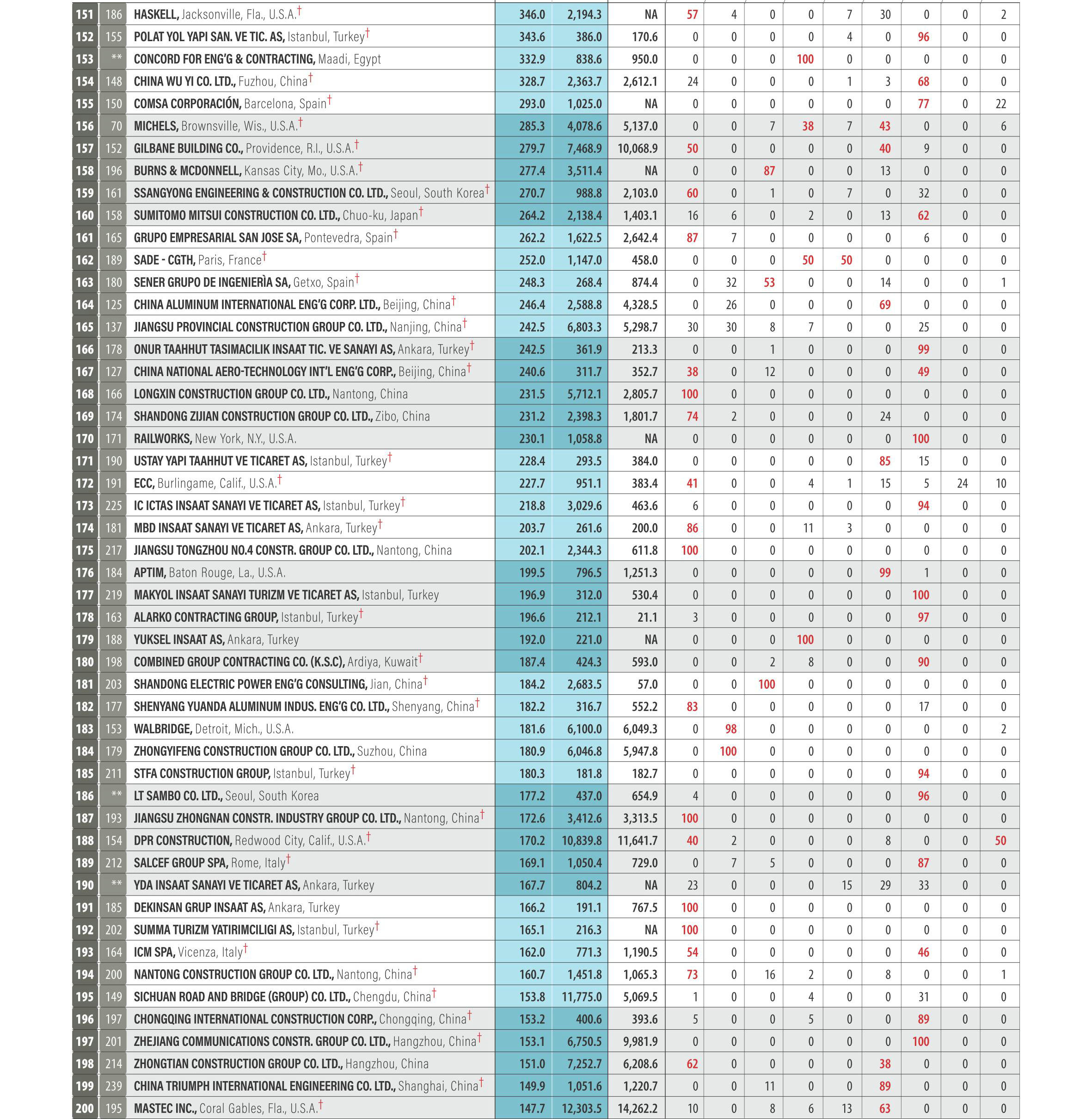 在ENR同期發布的“最大250家全球承包商”榜單中(以國內與國際營業額合計排序),共7家中國企業進入前10強,與上年度持平,其中中國建筑、中國中鐵、中國鐵建、中國交建包攬前4位,中國電建排名第6位、中冶科工排名第7位、上海建工排名第8位。此外,中國能建、北京城建、山西建投、中國化學工程、陜西建工、湖南建投、北京建工、綠地大基建、中國核建、安徽建工、特變電工、中油工程、山東高速、浙江建投、四川路橋、東方電氣、上海城建等企業進入榜單前50強,體現了中國企業在全球基建行業的重要地位。
