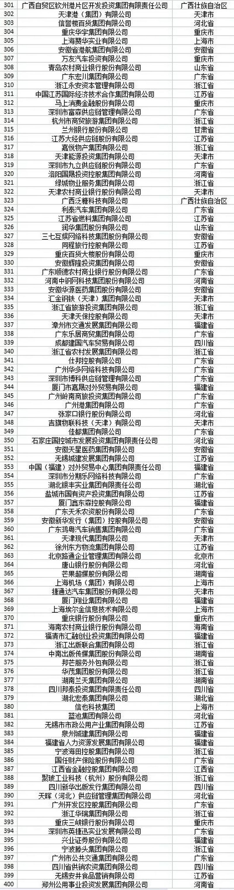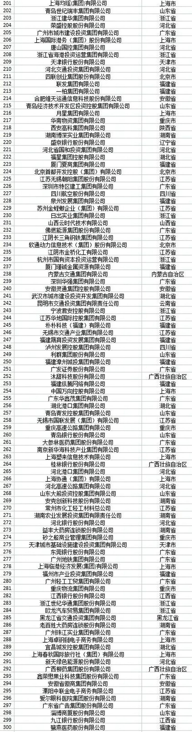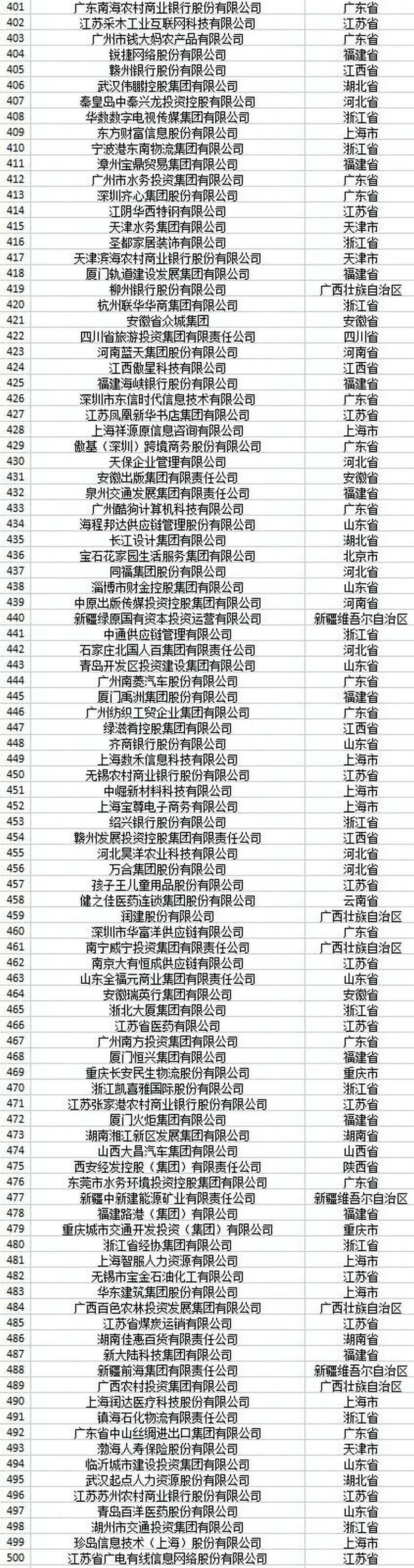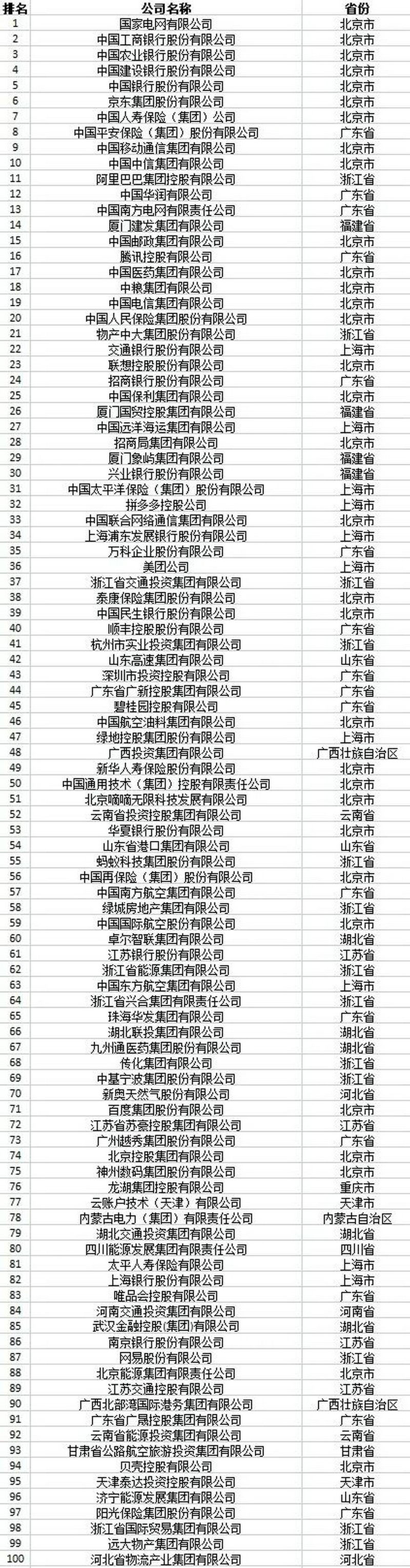 位列榜單前10位的企業分別是:國家電網有限公司、中國工商銀行股份有限公司、中國農業銀行股份有限公司、中國建設銀行股份有限公司、中國銀行股份有限公司、京東集團股份有限公司、中國人壽保險(集團)公司、中國平安保險(集團)股份有限公司、中國移動通信集團有限公司和中國中信集團有限公司。