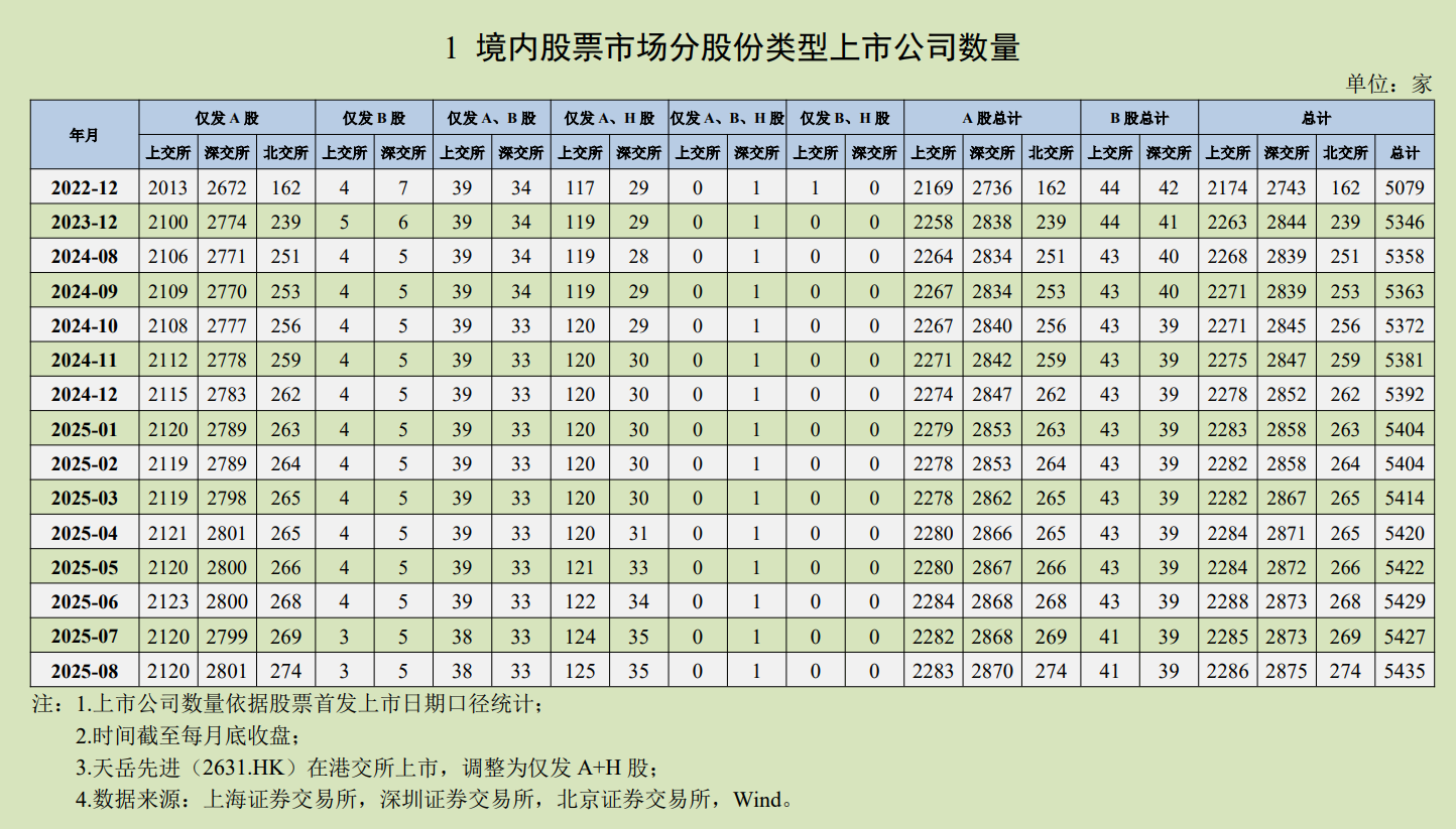 中國上市公司協會最新發布的數據顯示,截至2025年8月31日,境內股票市場共有上市公司5435家,滬、深、北證券交易所分別為2286、2875、274家。