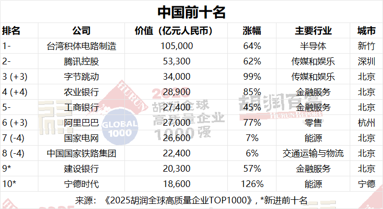 中國上榜企業中,表現最好的是臺積電(增長4.1萬億元)和騰訊(增長2萬億元)。其他表現突出的企業還包括字節跳動(增長1.7萬億元)、農業銀行(增長1.3萬億元)和阿里巴巴(增長1.2萬億元)。