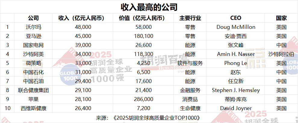 沃爾瑪的年收入最高,達4.8萬億元人民幣,其次是亞馬遜(4.5萬億元人民幣)和中國國家電網(3.9萬億元人民幣)