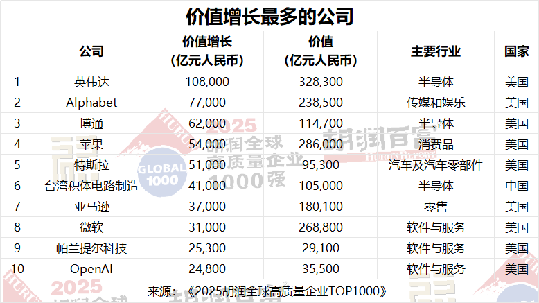 英偉達是今年價值增長最多的公司,增加了10.8萬億元人民幣,其次是Alphabet(7.7萬億元人民幣)和博通(6.2萬億元人民幣)