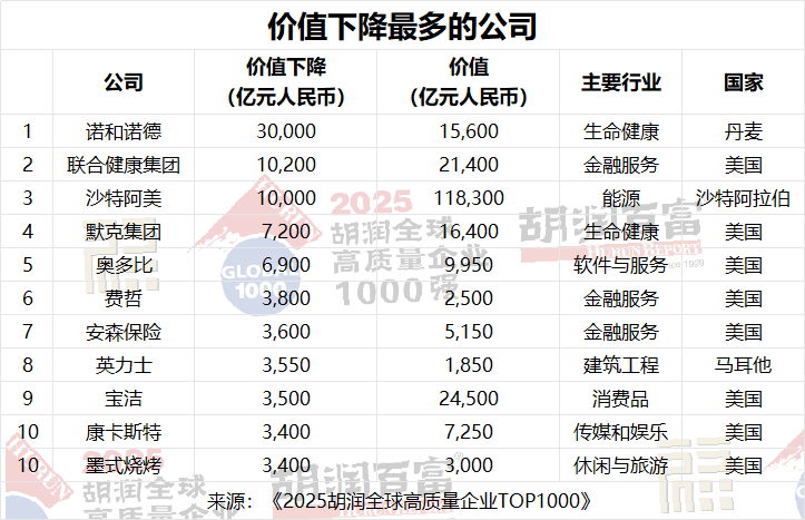 價值下降最多的上榜企業是諾和諾德,減少了3萬億元人民幣,至1.6萬億元人民幣,反映出該公司減肥藥組合歷經多年高速增長后,投資者情緒有所回落。聯合健康集團的價值下降了1萬億元人民幣,至2.1萬億元人民幣,受到監管審查和醫療成本壓力上升的影響。沙特阿美價值下降了1萬億元人民幣,至11.8萬億元人民幣,原因是油價走軟和能源行業市盈率走弱。奧多比下跌6900億元人民幣至9950億元人民幣,原因是人工智能驅動的創意軟件面臨競爭壓力。