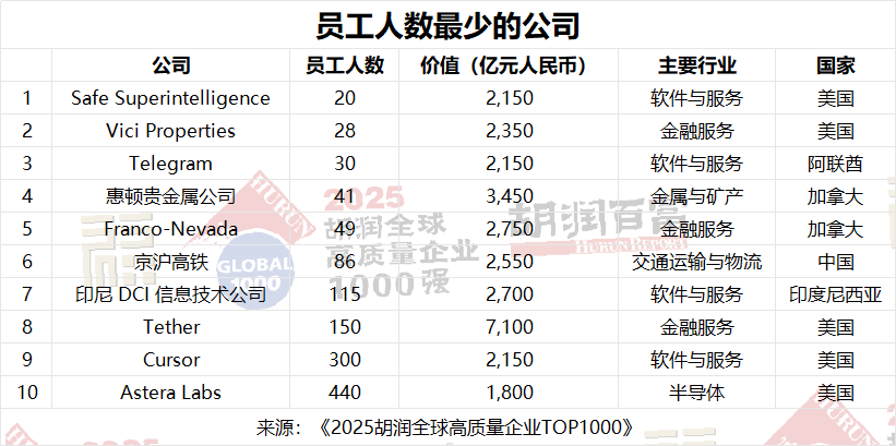 胡潤全球高質量企業TOP1000包括一批超精益公司,這些公司以非常小的團隊創造了巨大的價值。