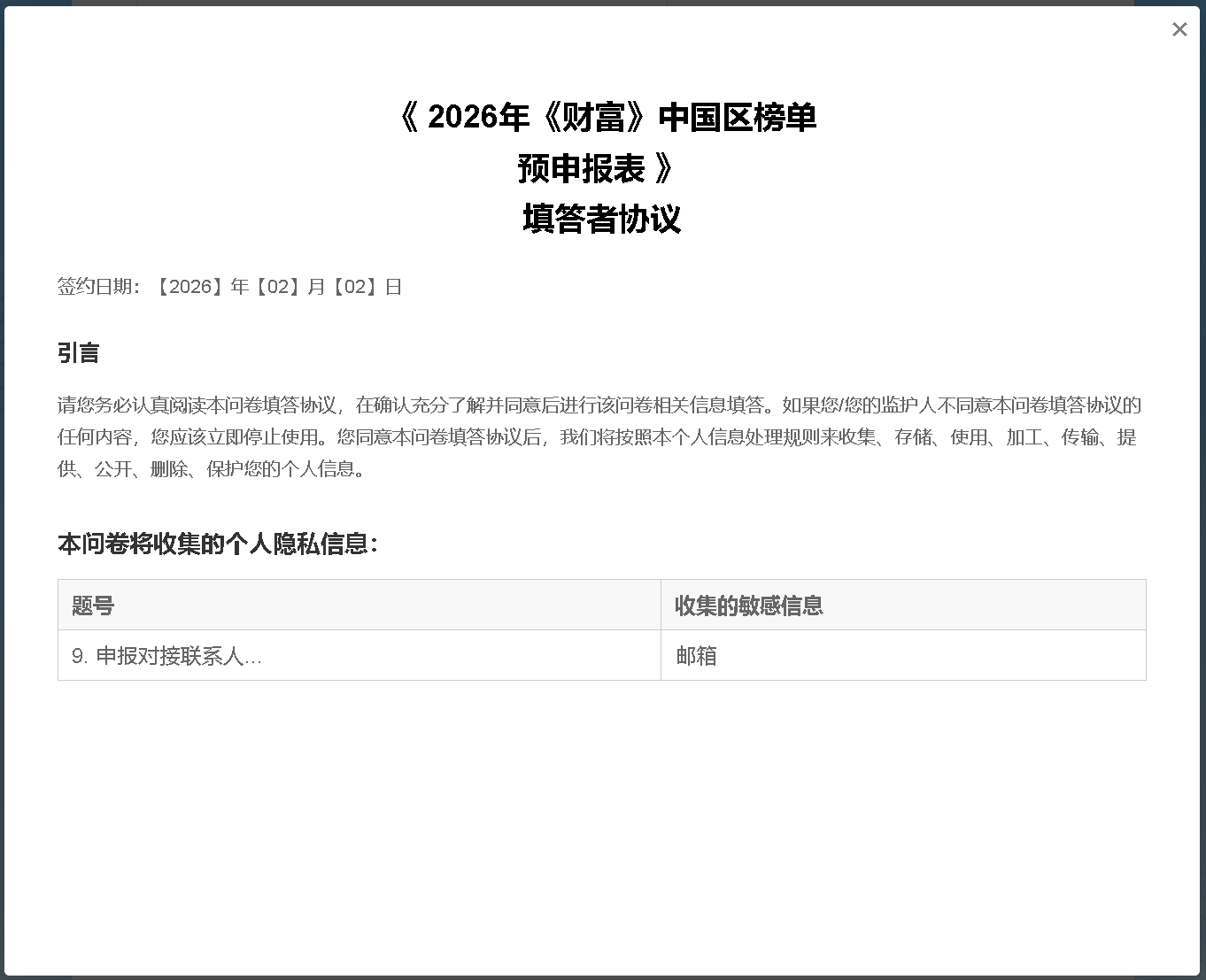 我們將協助問卷發布方收集您(作為問卷發布對象)主動填寫的問卷內容(下稱“問卷數據”,根據屆時您填寫的問卷數據,其中可能會包含您的個人信息)。請注意,您(作為問卷發布對象)應當自行判斷向問卷發布方提供相應問卷數據的風險,一旦您填寫并提交了問卷,相關問卷數據即歸于問卷發布方控制,如您拒絕向問卷發布方提供問卷數據,請勿主動填寫并提交問卷。