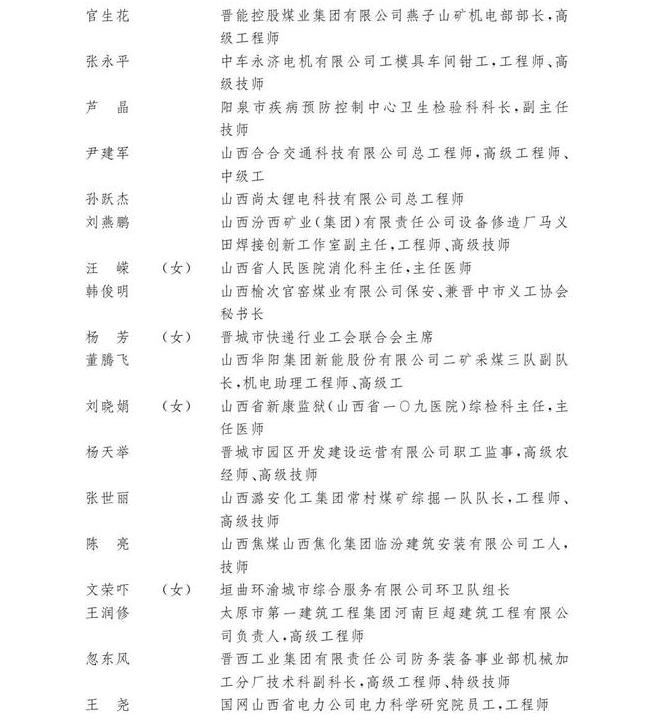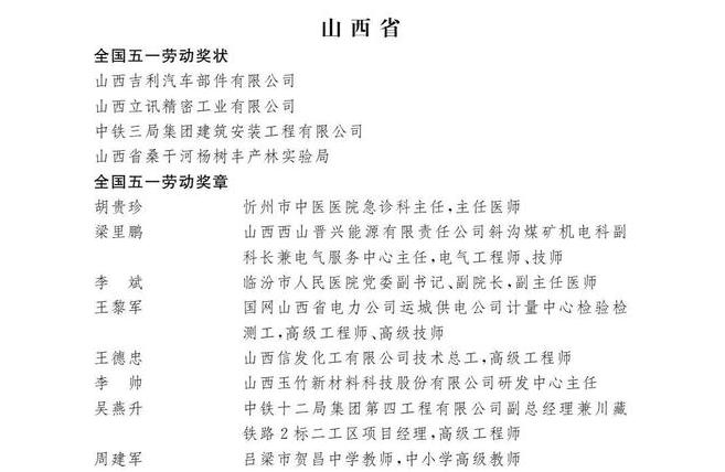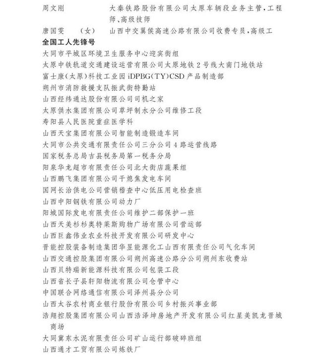 表彰會上,我省中鐵三局集團建筑安裝工程有限公司等4家單位獲全國五一勞動獎狀;官生花等27名個人獲全國五一勞動獎章;太原中鐵軌道交通建設運營有限公司太原地鐵2號線大南門地鐵站等29個集體獲全國工人先鋒號。我省受表彰人員和集體以基層一線人員為主體,全國五一勞動獎章人選中,產業工人10名,占37.0%;其他一線職工和專業技術人員8名,占29.6%。特別關注了在推動我省經濟快速發展中發揮作用的非公有制企業、新就業形態勞動者等方面的職工,并突出了重點產業和在疫情重癥救治方面貢獻突出的醫務人員。其中,重點產業人選分別占全國五一勞動獎狀、全國五一勞動獎章、全國工人先鋒號的75%、55.6%、44.8%。