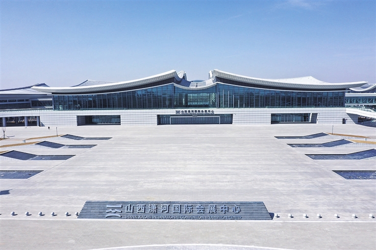 記者進入瀟河新城界,遠遠就能看到山西瀟河國際會展中心酷似黃河奔騰浪花的屋頂,獨具山西地貌特征的山河意象躍然眼前。會展中心由北展、中展、南展三個建筑群組成。從中展登陸廳進入,拾級而上,便到了整個建筑群的中心位置。陽光透過巨大的鋼架穹頂,灑在光潔的地面上,人流可從這里通過南、北交通廳去往不同的展廳。