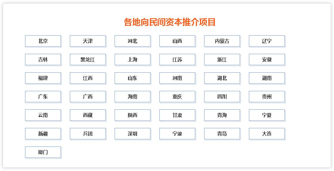 國家發展改革委有關負責人介紹,本次推介的項目,從行業領域看,城建、農業、旅游等項目數量較多,城建、公路、水路港口等項目規模較大。從地區分布看,東部、中部、西部、東北地區分別推介2213個、1020個、1497個、164個項目。從參與方式看,民間資本可以通過控股或參股項目公司等多種方式,參與重點項目建設運營。
