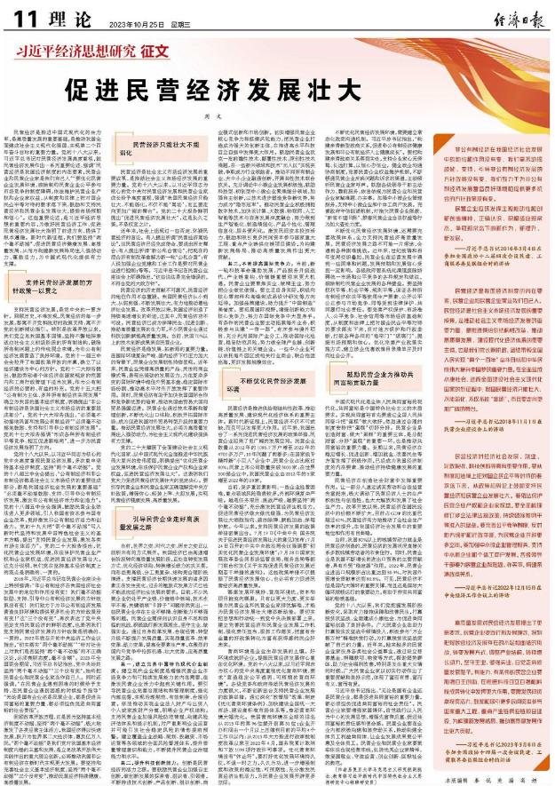 民營經濟是社會主義市場經濟發展的重要成果,是推動社會主義市場經濟發展的重要力量。黨的十八大以來,以習近平同志為核心的黨中央對民營經濟發展和民營企業家成長給予高度重視,強調“我國民營經濟只能壯大、不能弱化,不僅不能‘離場’,而且要走向更加廣闊的舞臺”。黨的二十大報告鮮明提出“促進民營經濟發展壯大”,這是長久之策,不是權宜之計。