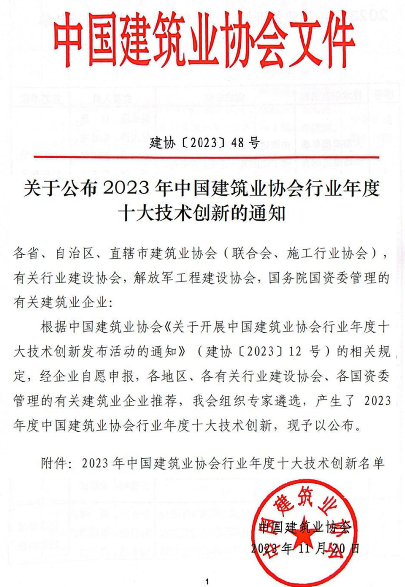 關于公布2023年中國建筑業協會行業年度十大技術創新的通知