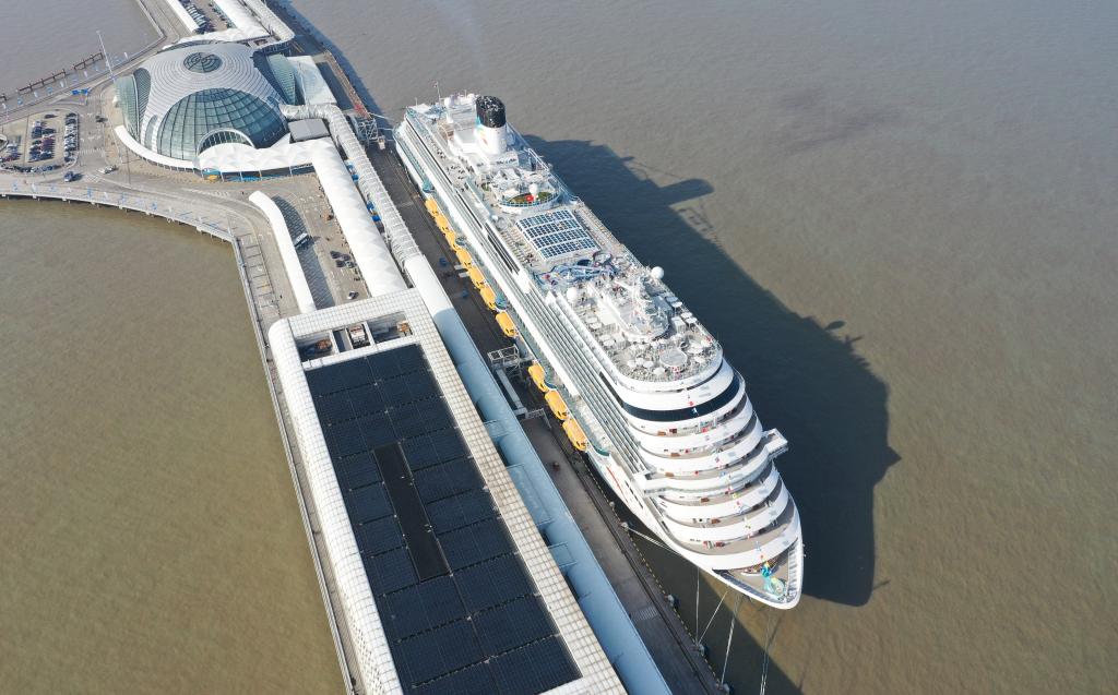 1月1日,“愛達·魔都號”停靠在上海吳淞口國際郵輪港(無人機照片)。新華社記者 丁汀 攝
