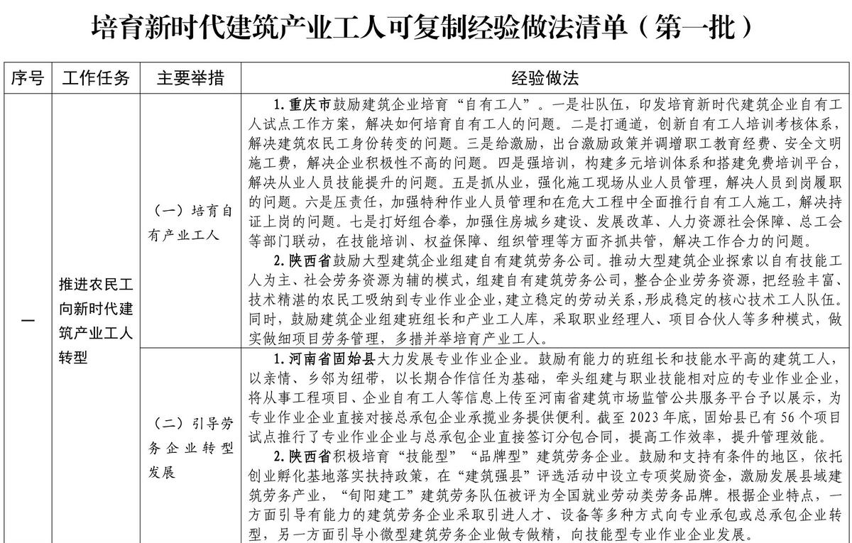 按照《住房和城鄉建設部等部門關于加快培育新時代建筑產業工人隊伍的指導意見》要求,各地圍繞推進農民工向新時代建筑產業工人轉型、完善建筑工人實名制管理、提升建筑工人技能水平、加強統籌協作和政策支持、保障建筑工人合法權益等方面,積極探索、大力推進新時代建筑產業工人隊伍建設,取得了積極成效。近日,住房和城鄉建設部印發培育新時代建筑產業工人可復制經驗做法清單(第一批)。