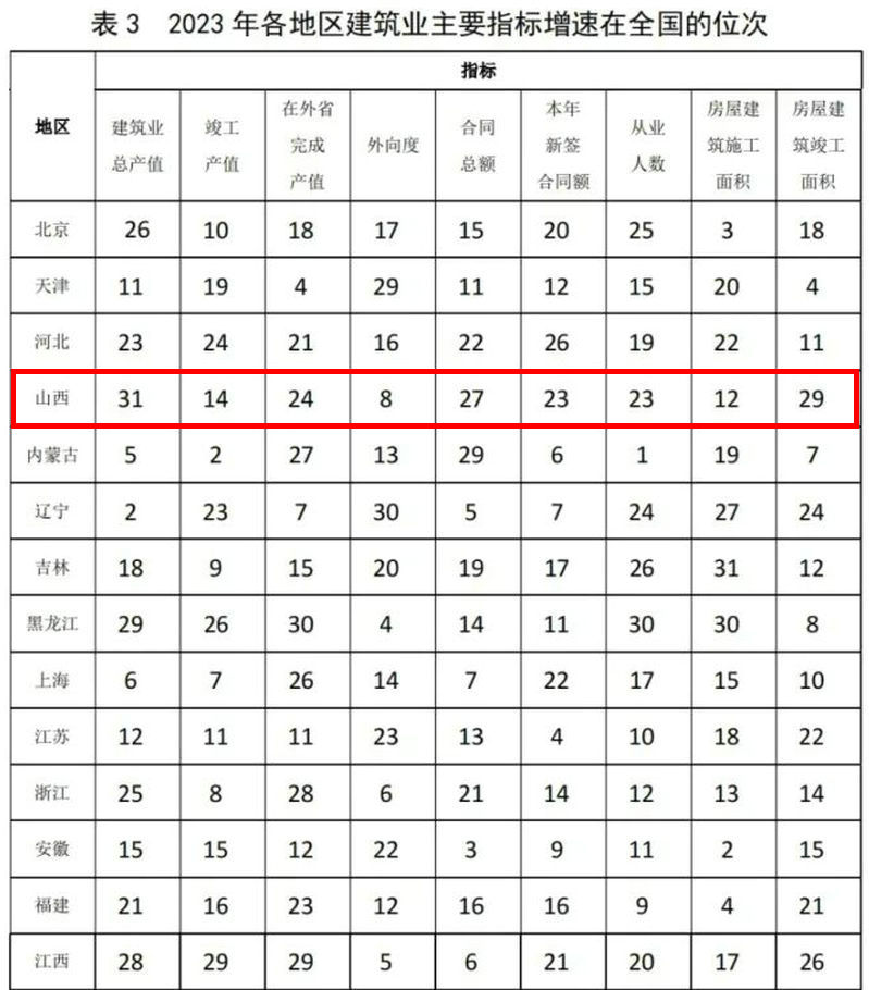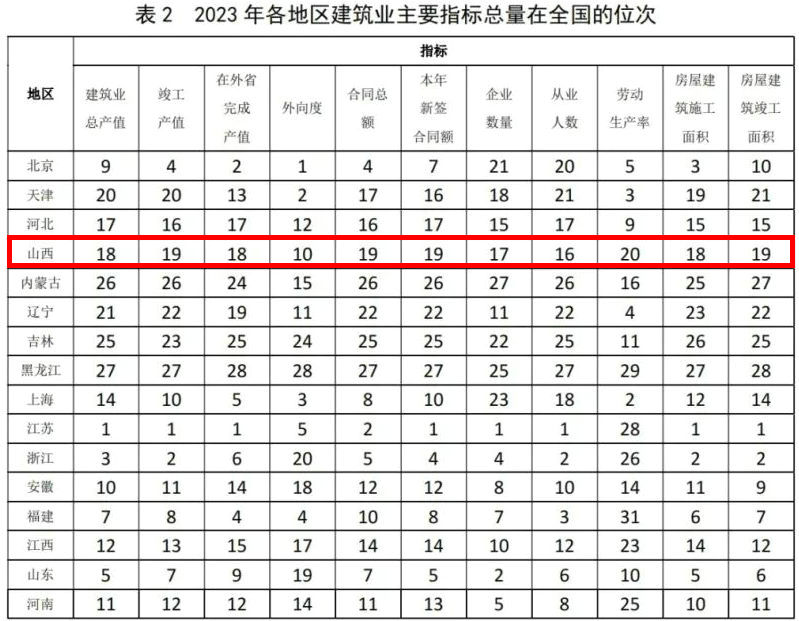2023年,各地區(qū)建筑業(yè)主要指標總量及增速在全國的位次分別如表2、表3所示。