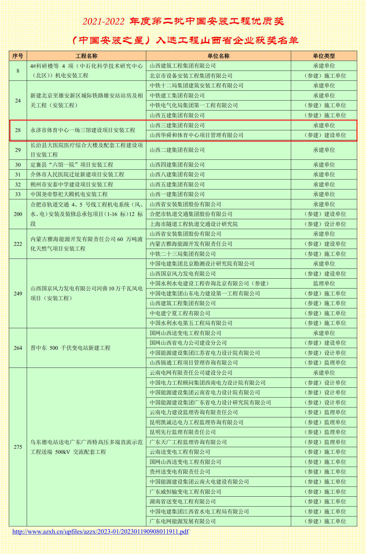 ,山西建投三建集團承建的永濟市體育中心一場三館建設項目榮膺“中國安裝工程優(yōu)質獎”(中國安裝之星)。
