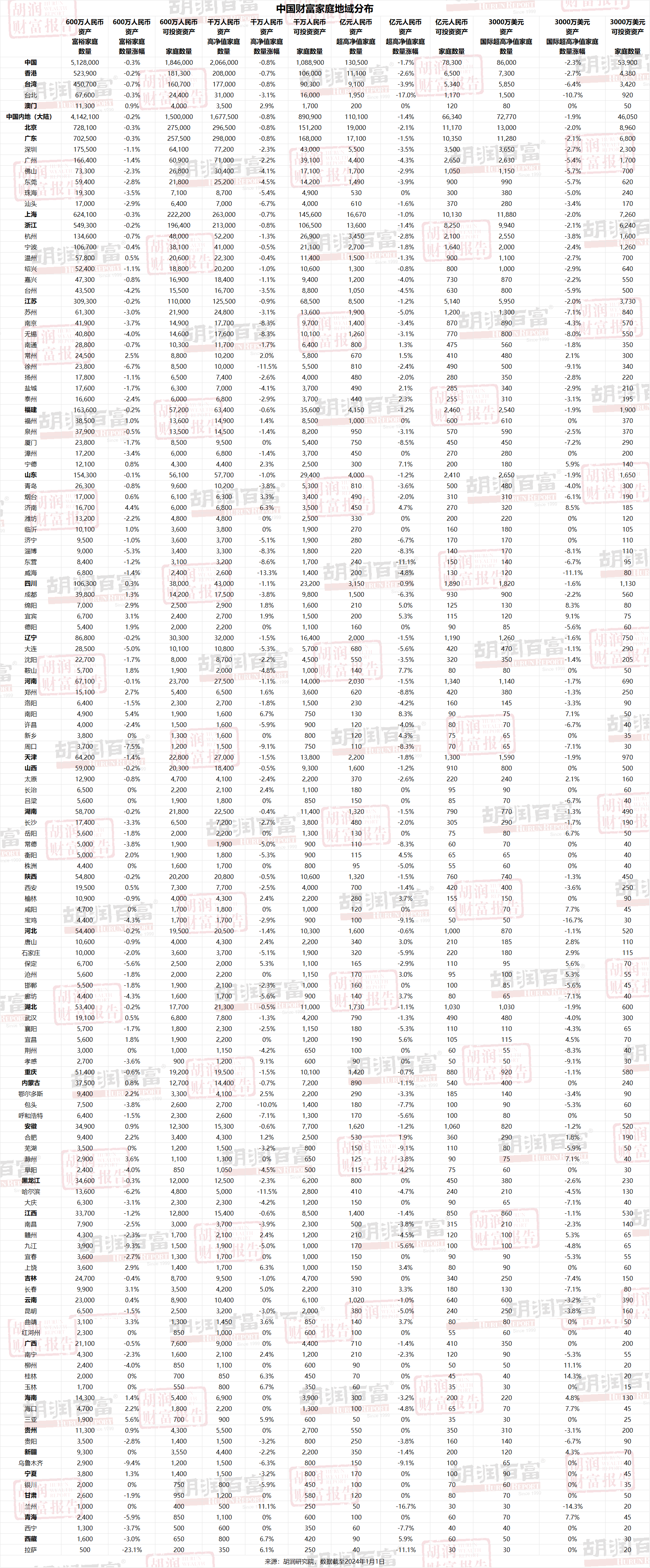 中國內地(不包括港澳臺)的富裕家庭(資產600萬以上)數量略有下降,達到414.2萬戶,同比減少0.2%,即減少了9,800戶,其中擁有600萬可投資資產的家庭為150萬戶。高凈值家庭(資產千萬以上)數量為167.8萬戶,同比減少0.8%,減少了1.4萬戶,其中擁有千萬可投資資產的家庭為89.1萬戶。超高凈值家庭(資產億元以上)數量為11萬戶,同比減少1.4%,減少了1,530戶,其中擁有億元可投資資產的家庭為6.6萬戶。國際超高凈值家庭(資產3000萬美元以上)數量為7.3萬戶,同比減少1.9%,減少了1,400戶,其中擁有3000萬美元可投資資產的家庭為4.6萬戶。