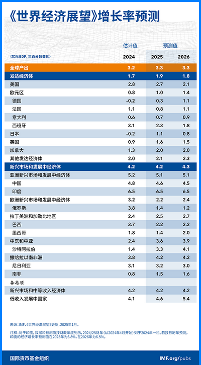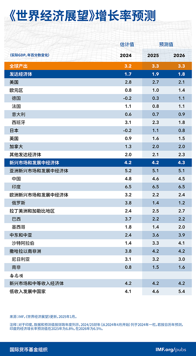 預計2025年和2026年全球經濟增速均為3.3%,與2024年10月《世界經濟展望》的預測基本持平。其中,美國的預期增速被上調,這抵消了其他地區增速的下調。近期前景的特點在于各國的路徑出現分化,而中期的增長風險偏向下行。通脹壓力的重新抬頭可能阻礙貨幣政策轉向,并對財政可持續性和金融穩定造成影響。政策組合應妥善權衡取舍并重建緩沖。