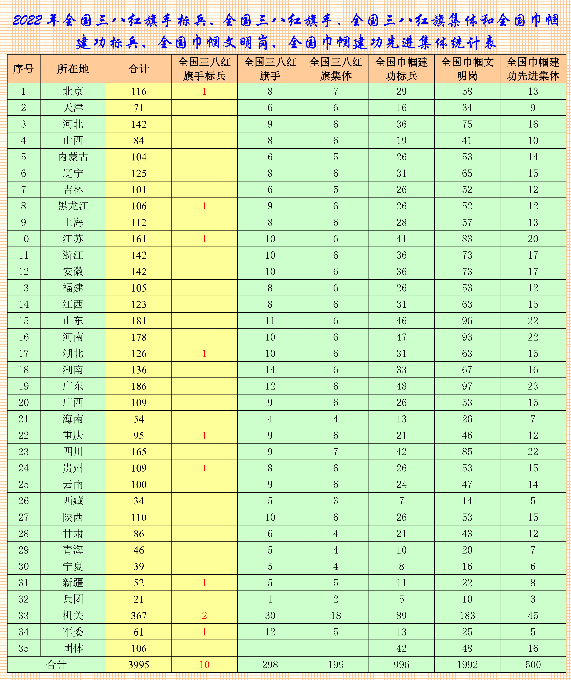 2022年全國婦聯關于表彰全國三八紅旗手標兵 全國三八紅旗手 全國三八紅旗集體和全國巾幗建功標兵 全國巾幗文明崗 全國巾幗建功先進集體名單