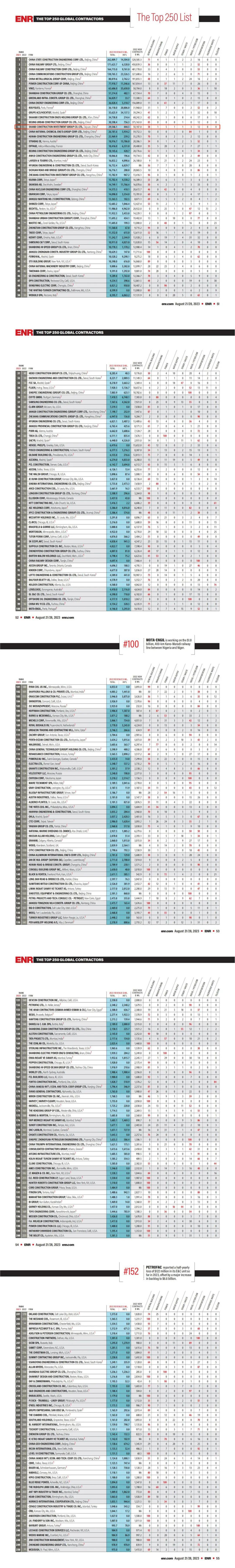 2023年8月23日,美國《工程新聞記錄》(ENR)雜志發布了2023年度全球承包商250強排行榜,中國內地共有61家企業入榜,總體進榜數量比上一年度減少了2家企業。